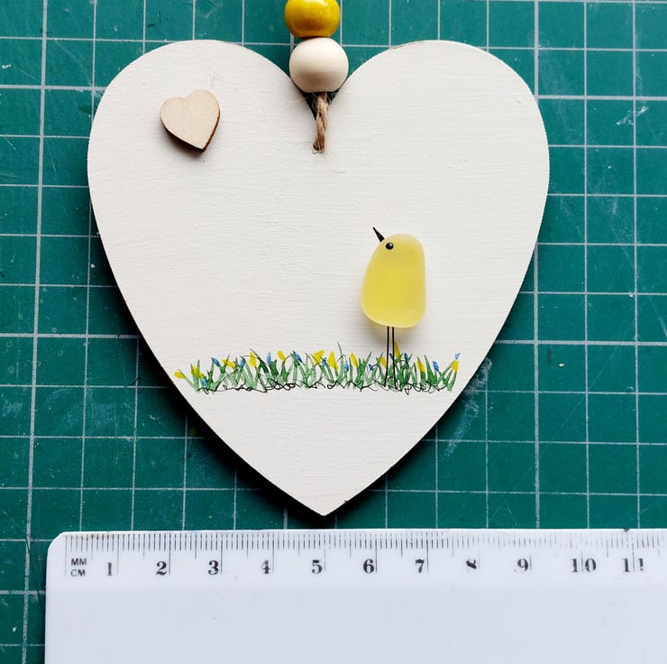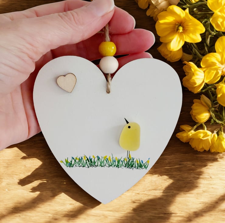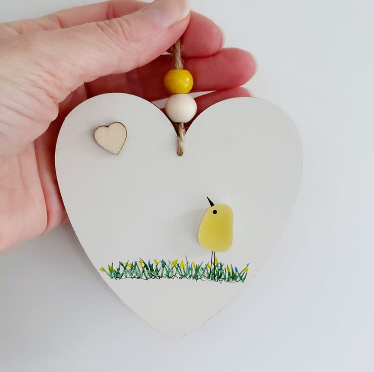 Celebrate Easter with this cute yellow sea glass bird - a delightful heart decoration, available in 2 sizes. These unique and individually crafted cute little Easter chicks have been made with pieces of perfectly tumbled and frosted, hand-picked sea glass, that have been delicately painted and turned into little birds. The extra details on this design have been hand painted with watercolours and the whole design is complemented with jute so it can be hung. Choose your favourite size using the dimensions provided in the description below.