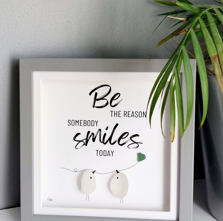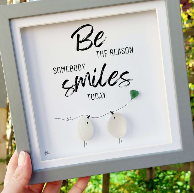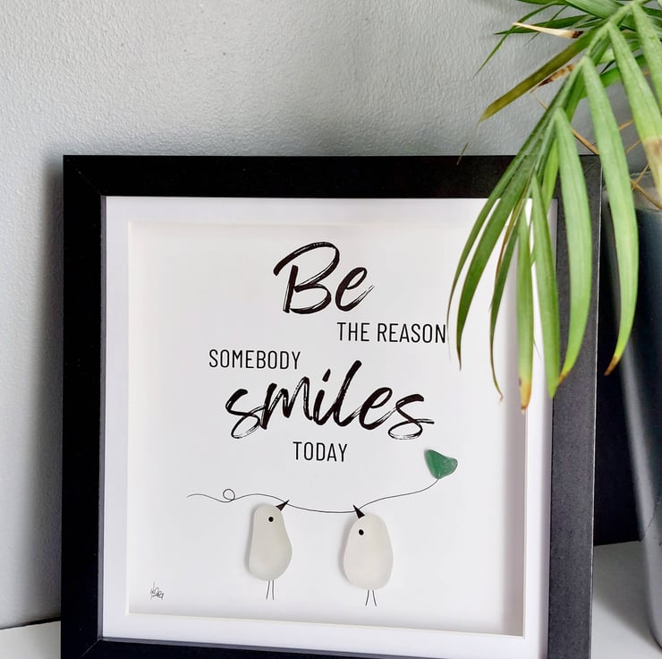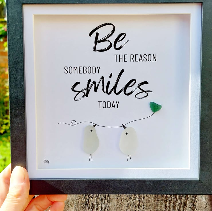 - This original artwork has been framed using a 20cm frame and mount. It is simple, elegant and makes use of beautiful, perfectly tumbled sea glass from Seaham.