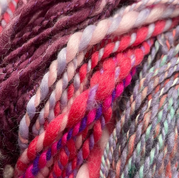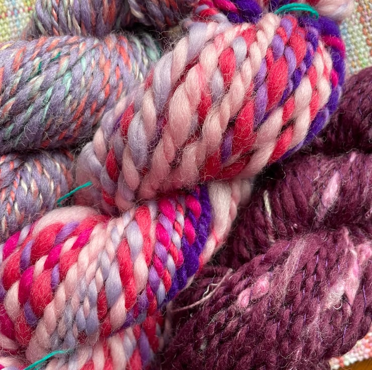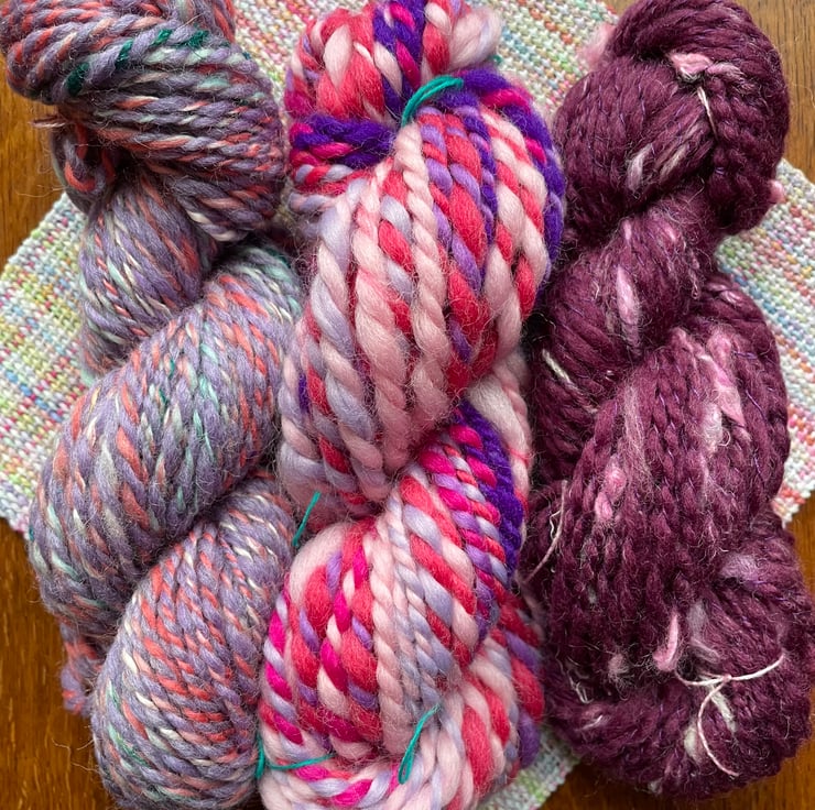Colours are blended on a drum carder and then the yarn is spun on an Ashford traditional spinning wheel. All made by hand, these art yarns are perfect for your next project. That might be knitting, crochet, weaving, embroidery or felting! The only limit is your imagination!! If you're stuck for ideas, find me on Tiktok where I regularly post projects I have completed using my handspun yarn.