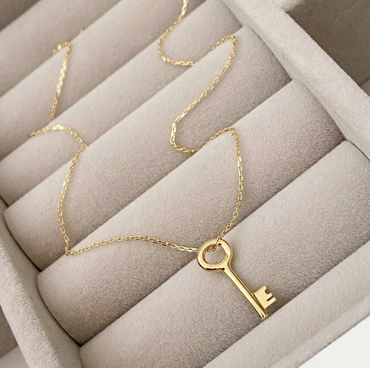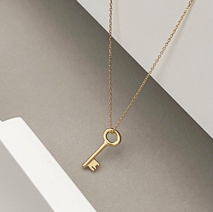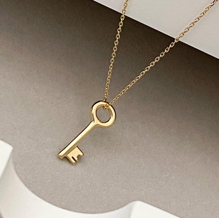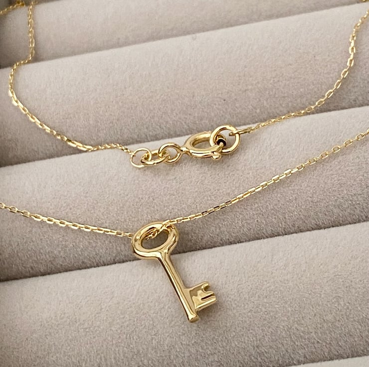 9ct solid yellow gold small and dainty key charm pendant and chain