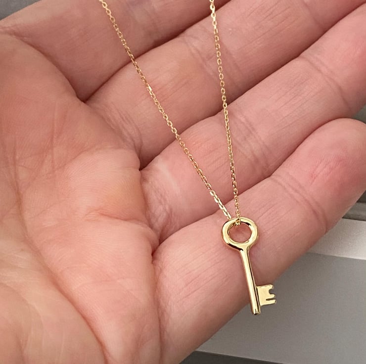 9ct solid yellow gold small and dainty key charm pendant and chain.