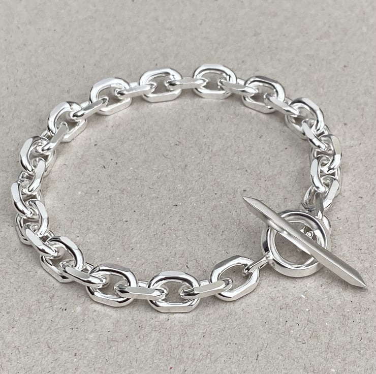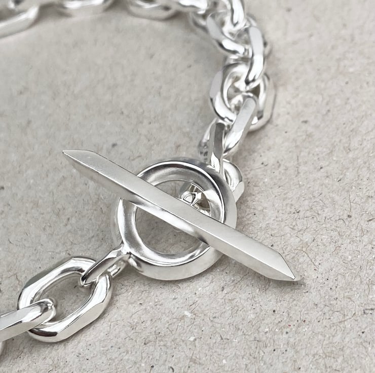 Oxidised or polished silver 8.5mm wide diamond cut trace chain bracelet with a unique handmade t bar design