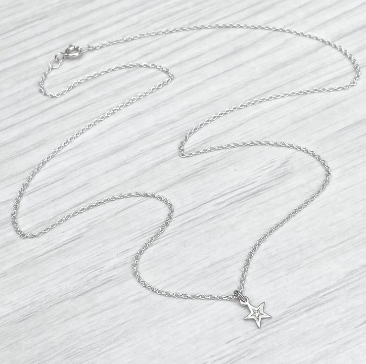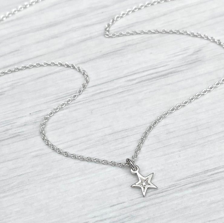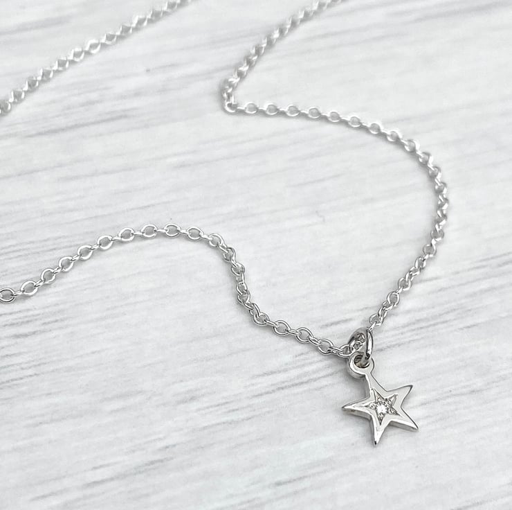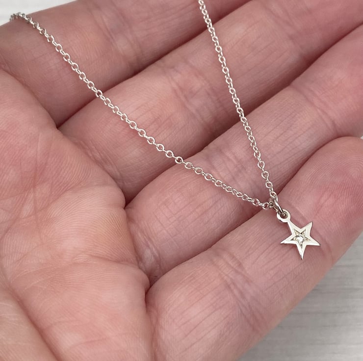 Sterling silver star engraved diamond tiny star charm pendant and chain