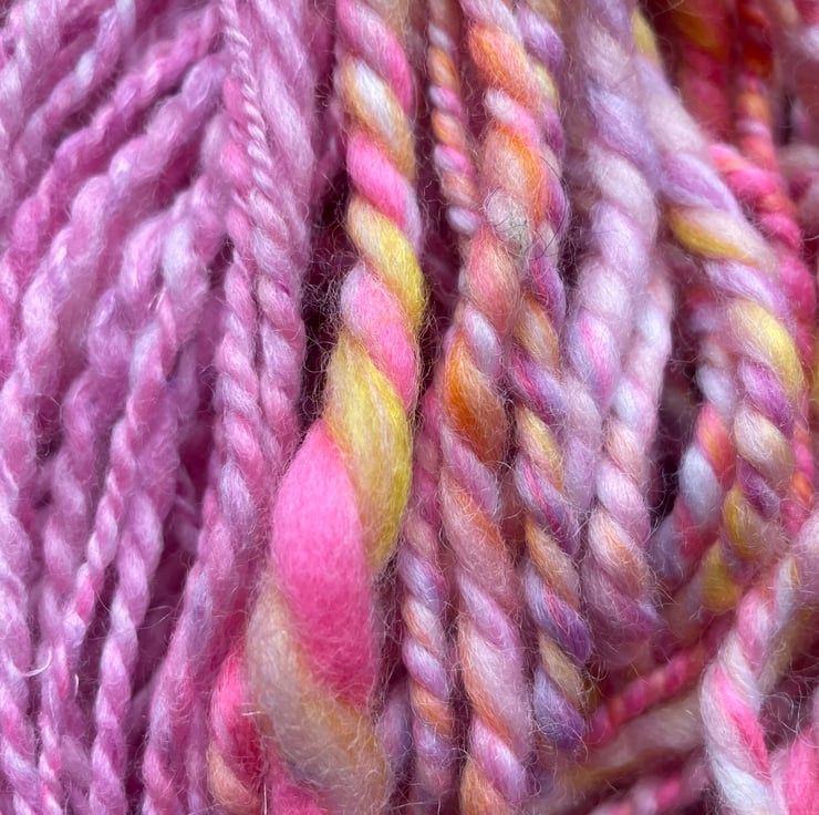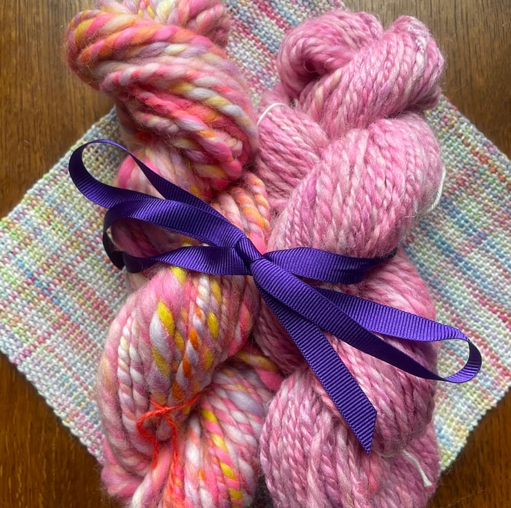 Colours are blended on a drum carder and then the yarn is spun on an Ashford traditional spinning wheel. All made by hand, these art yarns are perfect for your next project. That might be knitting, crochet, weaving, embroidery or felting! The only limit is your imagination!! If you're stuck for ideas, find me on Tiktok where I regularly post projects I have completed using my handspun yarn.