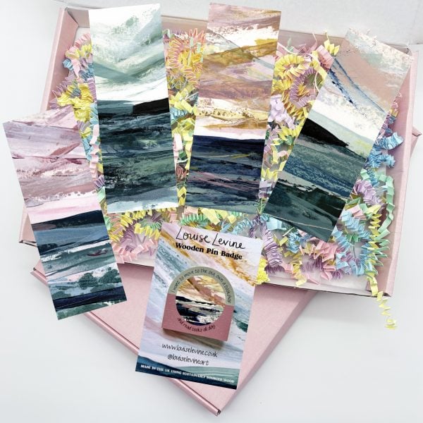 Letterbox gift box containing a pin badge and four bookmarks all printed from my original acrylic seascape art and presented in a beautiful pink box.