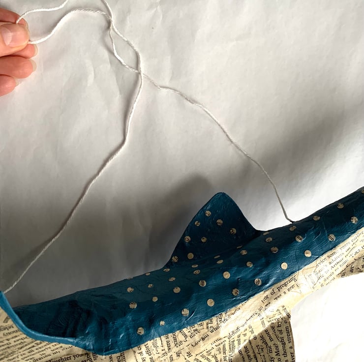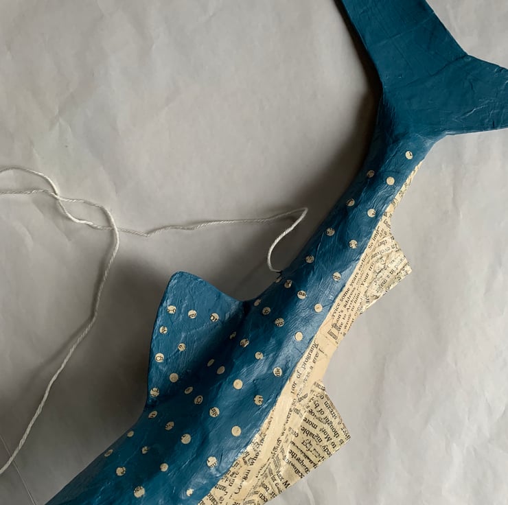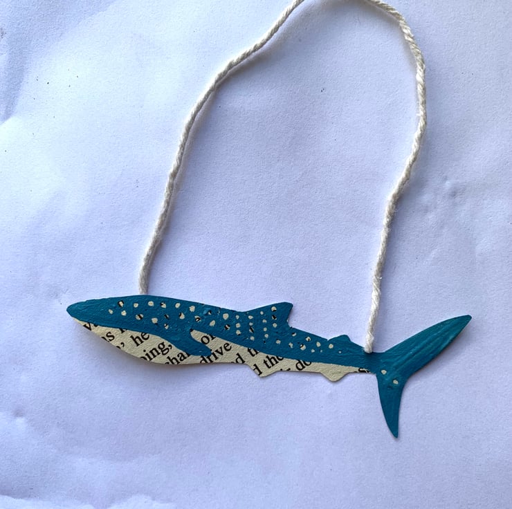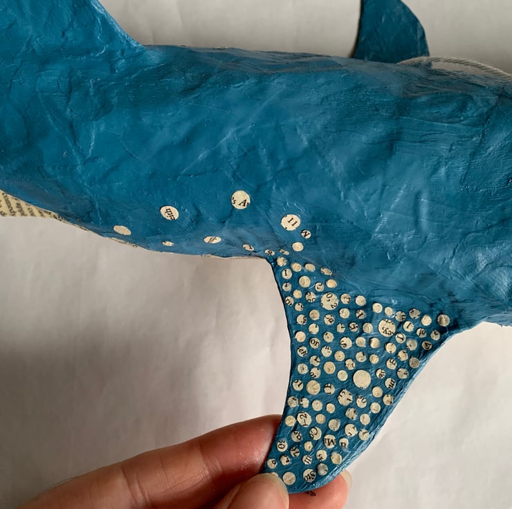 The whale shark will be lovingly handmade from vintage book pages and handpainted in blue acrylic paint, so that all the spots on it's back are book pages with exposed lettering