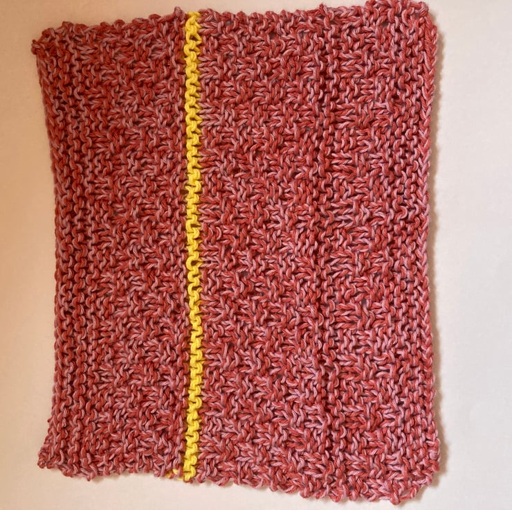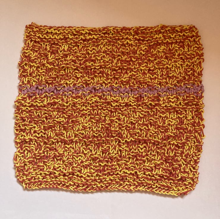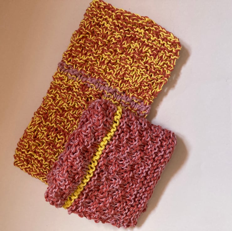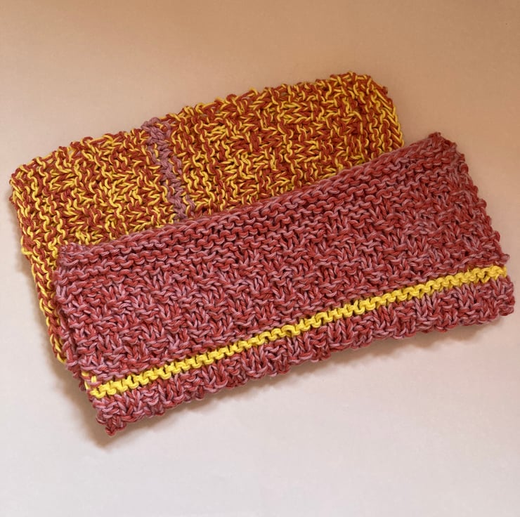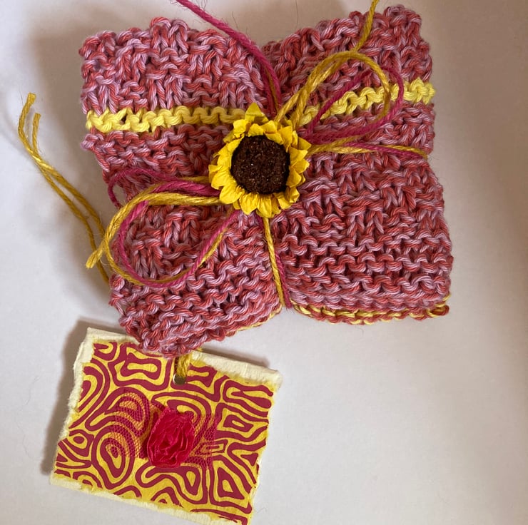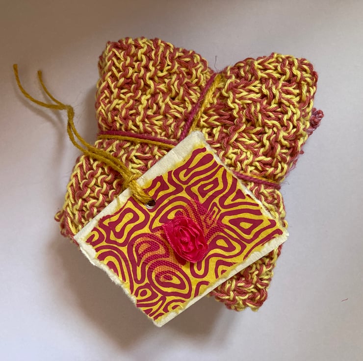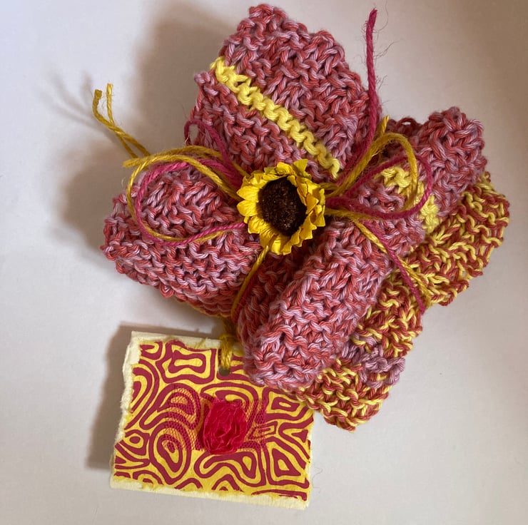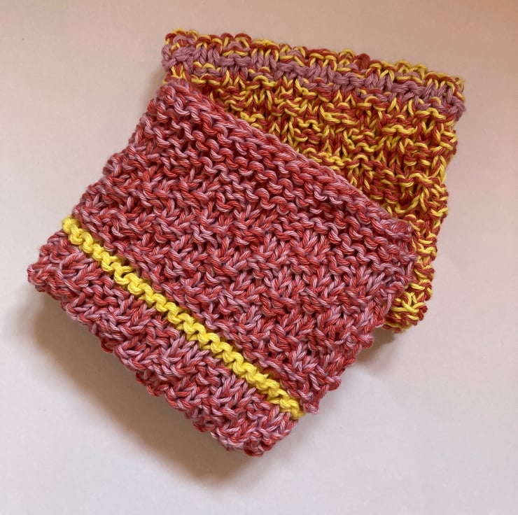 Both of these hand knitted eco friendly dish cloths are made from 100% cotton. They are knitted using 2 strands of double knitting cotton in shades of yellow, pink and lilac