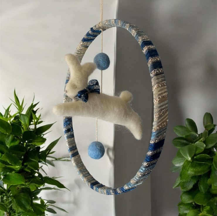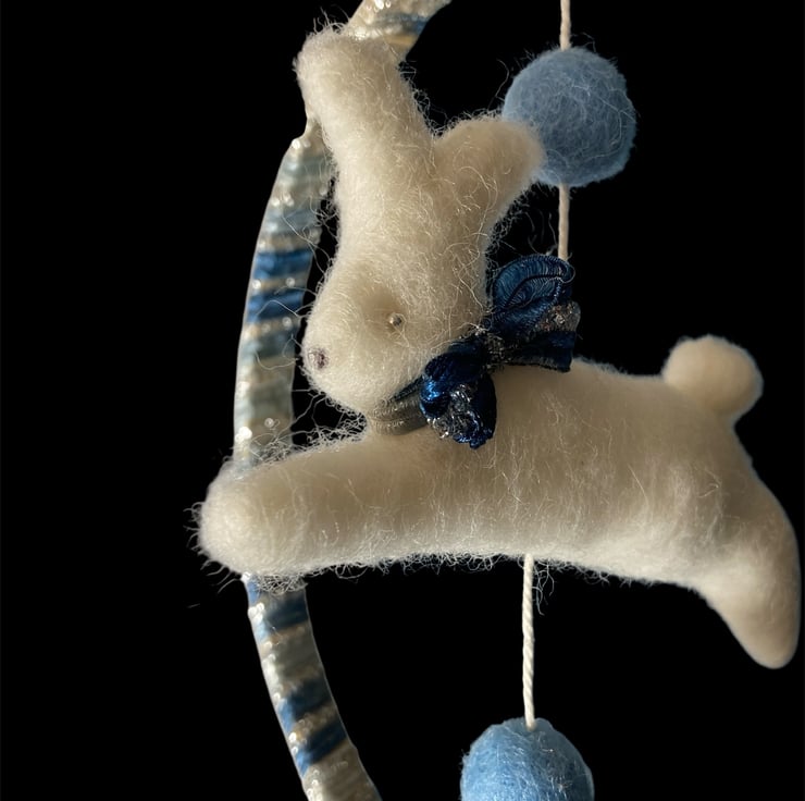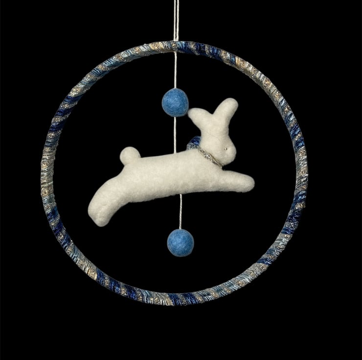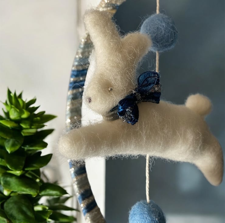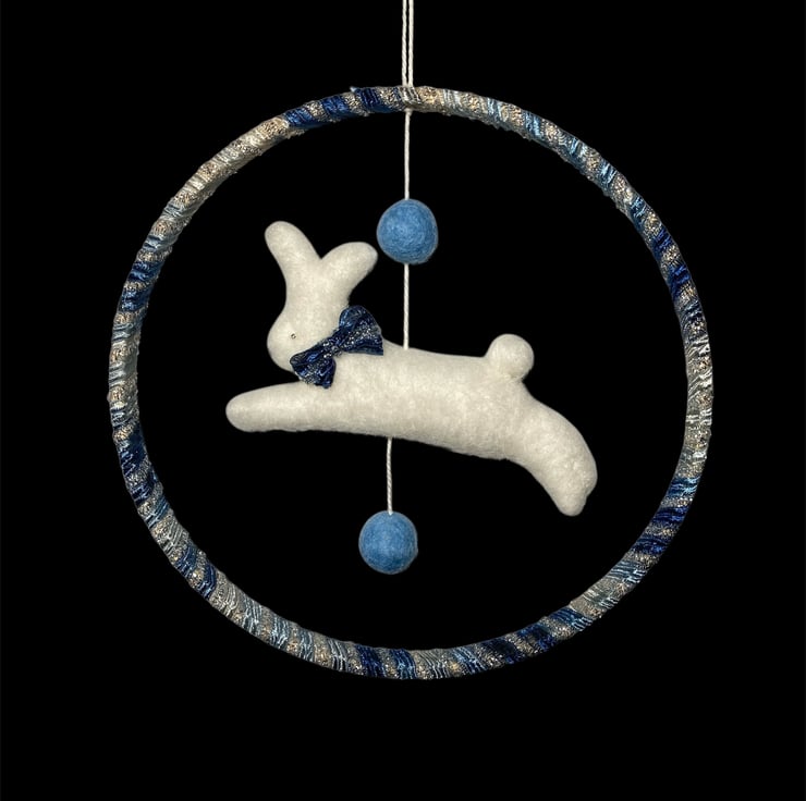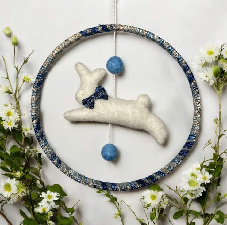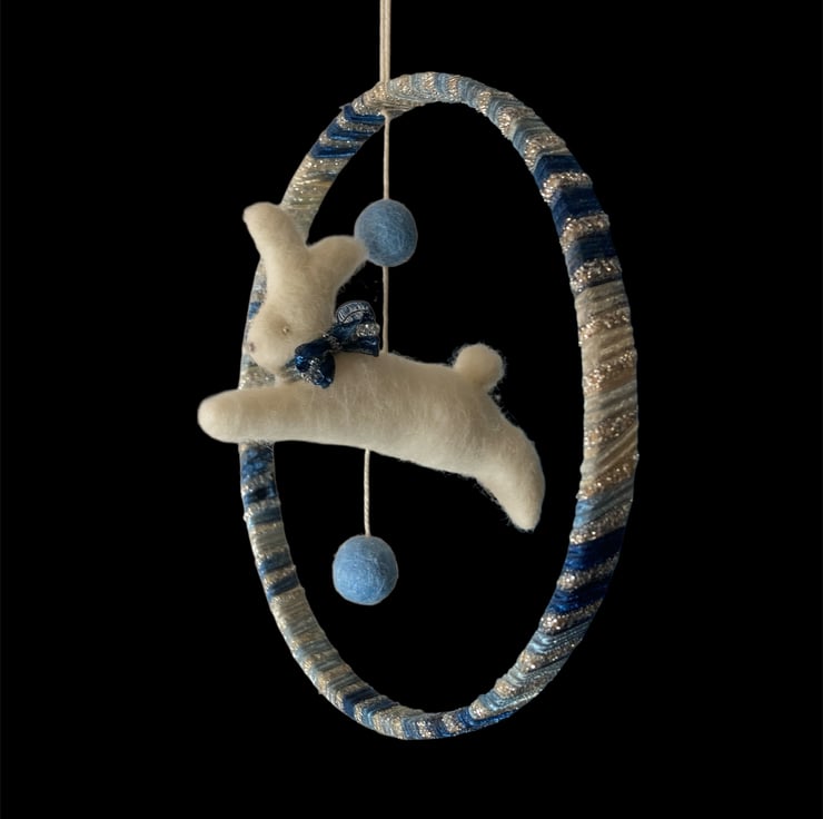 This pretty nursery decoration features a felted running white rabbit hanging within a ribbon wrapped wooden hoop. The bunny has a pretty blue sparkly bow which matches the ribbon used to wrap the hoop. Silver beads have been used for the eyes and the bunny is suspended from the hoop, along with a couple of blue felt balls , by means of a white cotton thread. A mall hanging loop has been added.