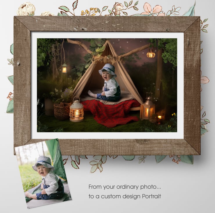 I offer a free checking service before you order, so you know your photo will work with the Portrait before you pay. Send your photo, telling me you'd like the Camping Trip design, to queries@photofairytales.co.uk (Visit https://www.photofairytales.co.uk/bestphoto.html for tips on choosing the best photo)
