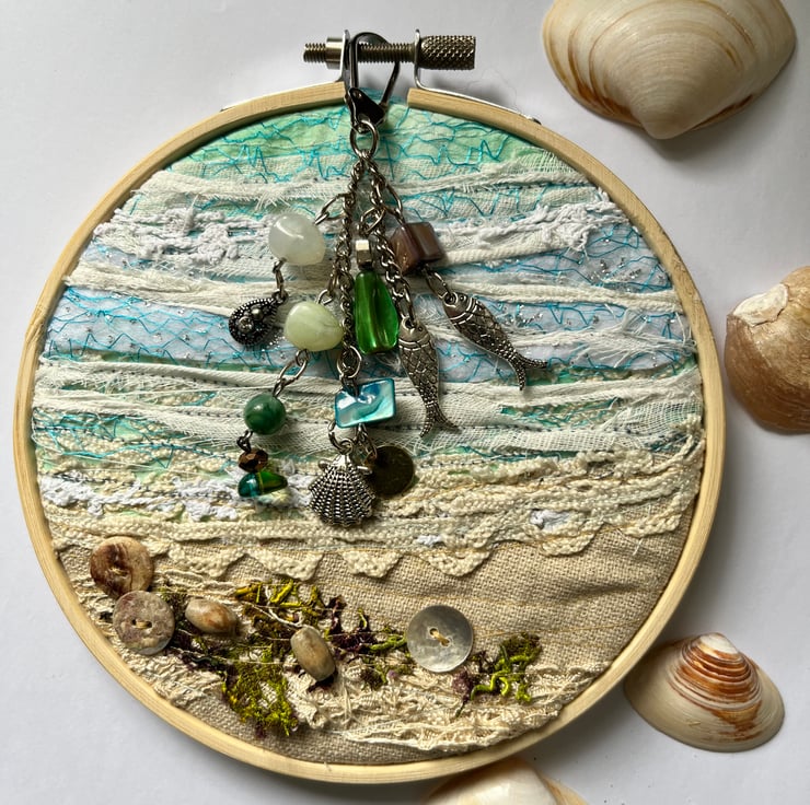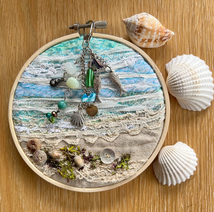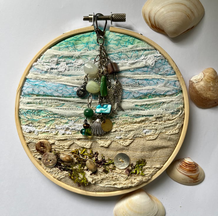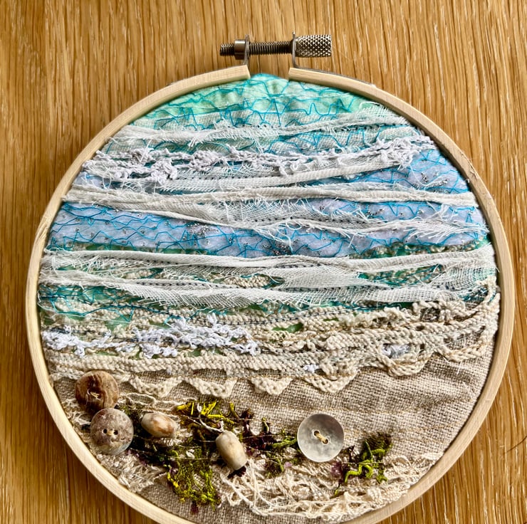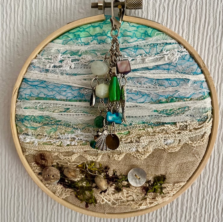 Fabrics and stitching have been used to create this hoop picture of the sea and beach.