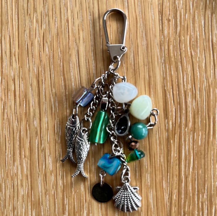 The bag charm has silver metal fish and shell. Blue, green and brown beads.