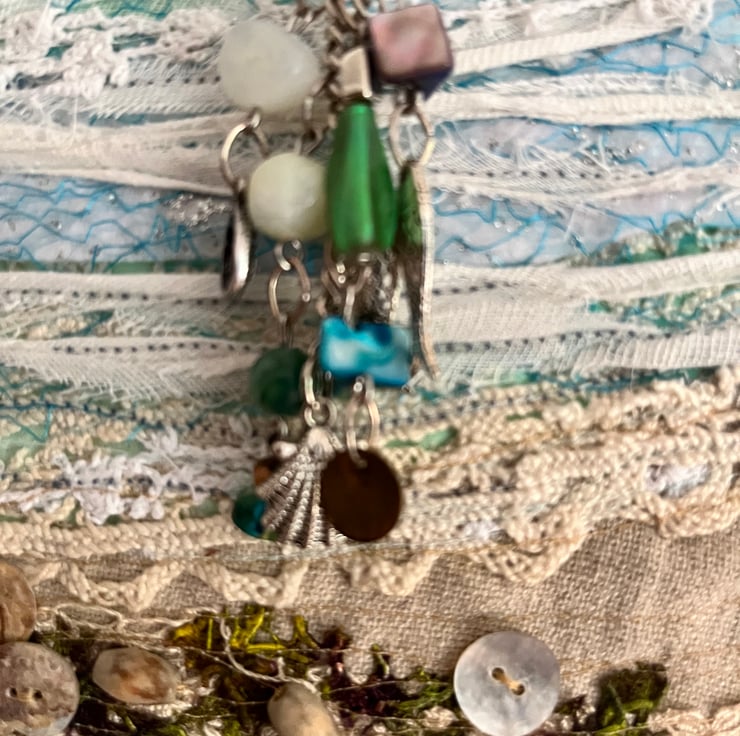 I’ve used vintage lace along with fabric scraps, machine stitched and beads and buttons for the picture.