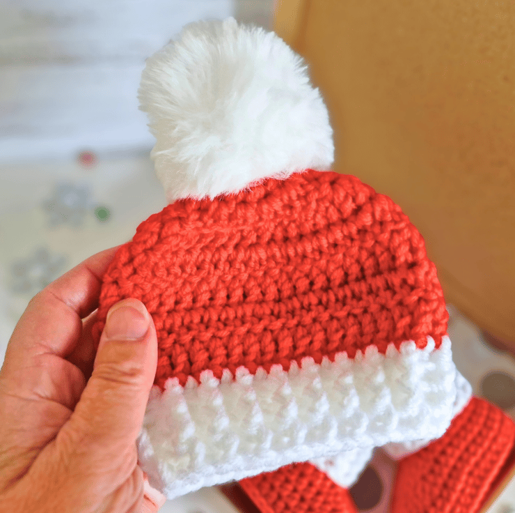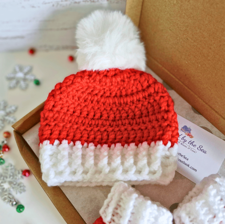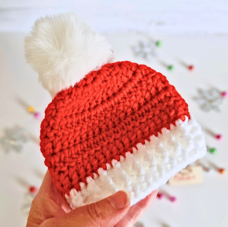 Celebrate baby’s first Christmas with this festive handmade crochet hat, finished with a soft white pom pom. Made in traditional red and white, it’s the perfect seasonal gift, stocking filler or keepsake for new parents.