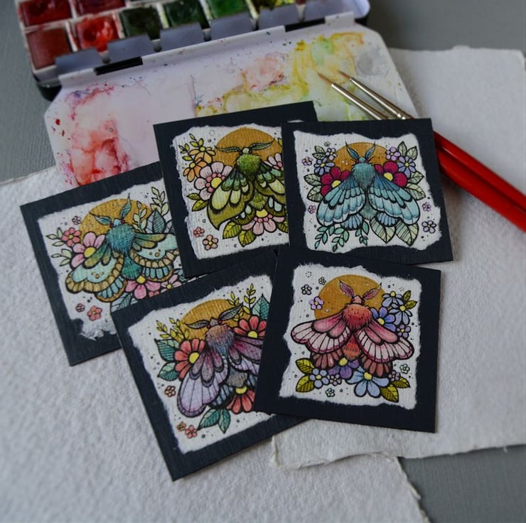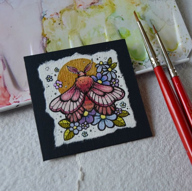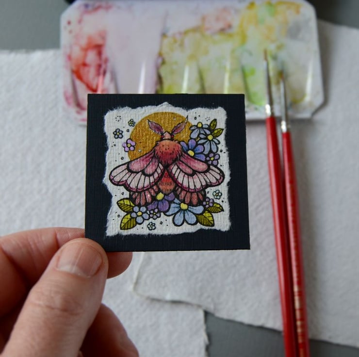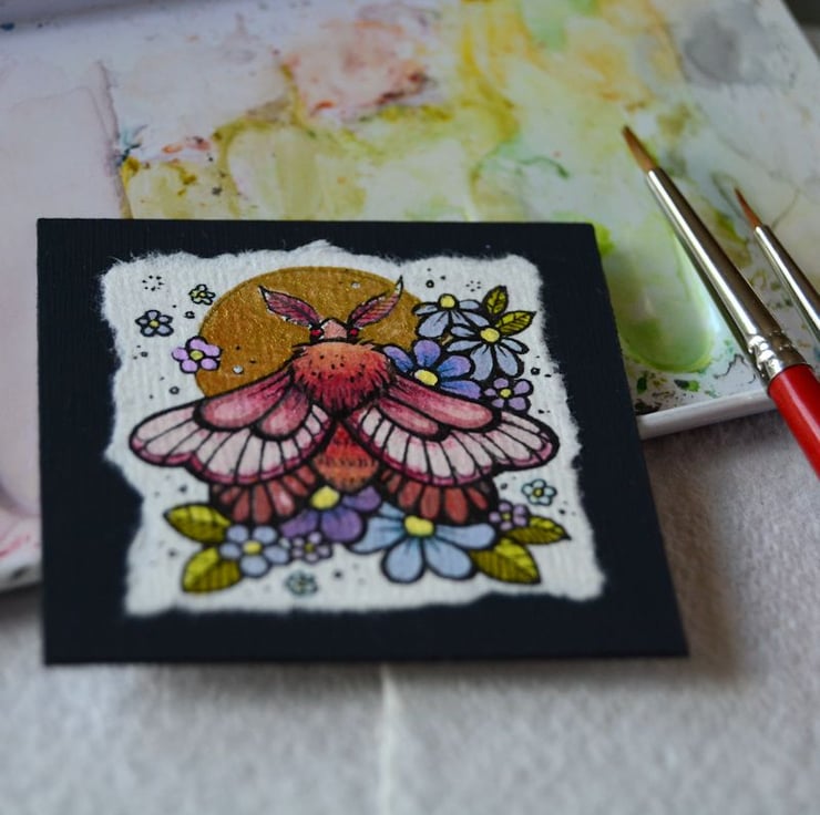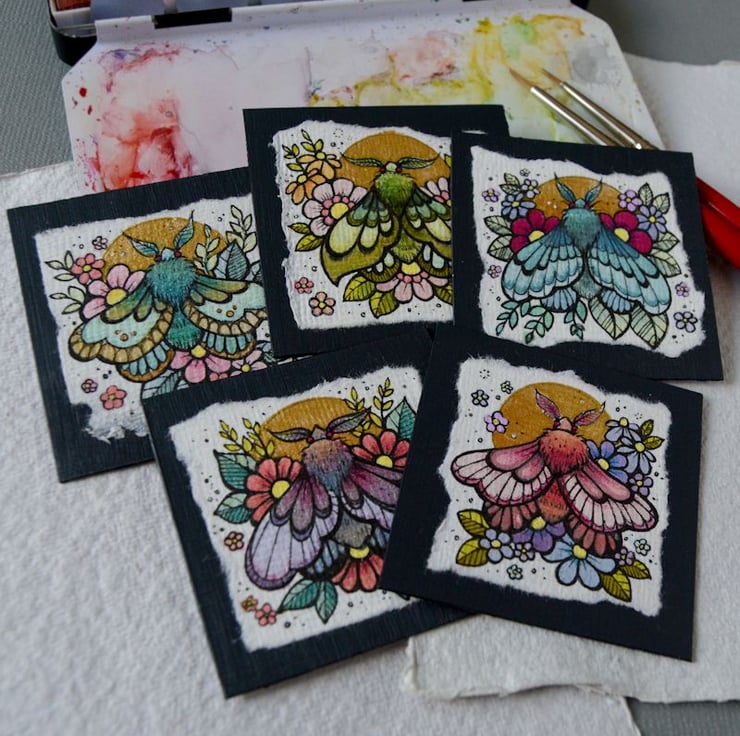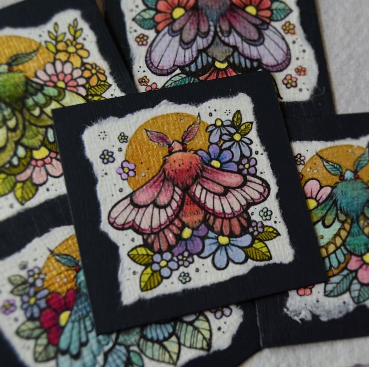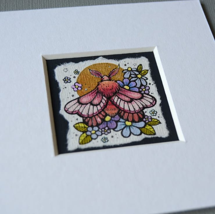 this is an original artwork in artists pens and watercolour pencils and paints, drawn on textured indian khadi paper, which is handmade from recycled cotton rag. the paper has been hand torn with an irregular edge, which I have then mounted to a twinchie painted with a paynes grey acrylic, to create a dark background.