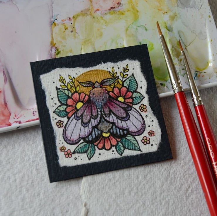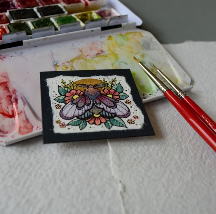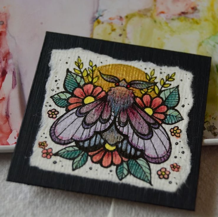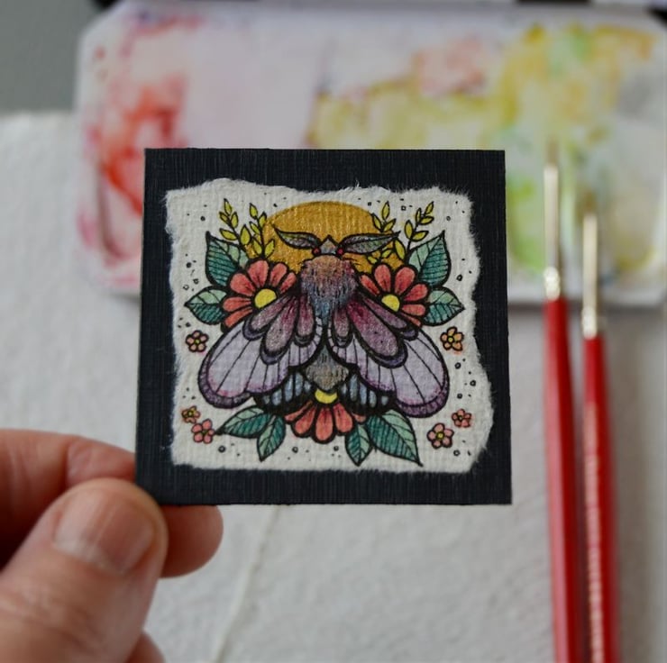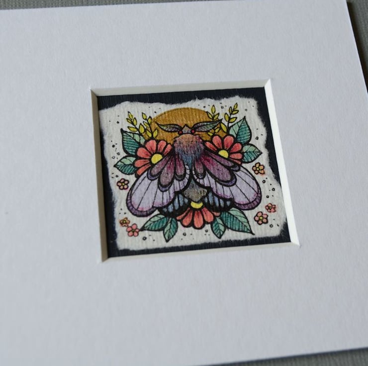 this is an original artwork in artists pens and watercolour pencils and paints, drawn on textured indian khadi paper, which is handmade from recycled cotton rag. the paper has been hand torn with an irregular edge, which I have then mounted to a twinchie painted with a paynes grey acrylic, to create a dark background.