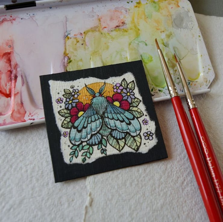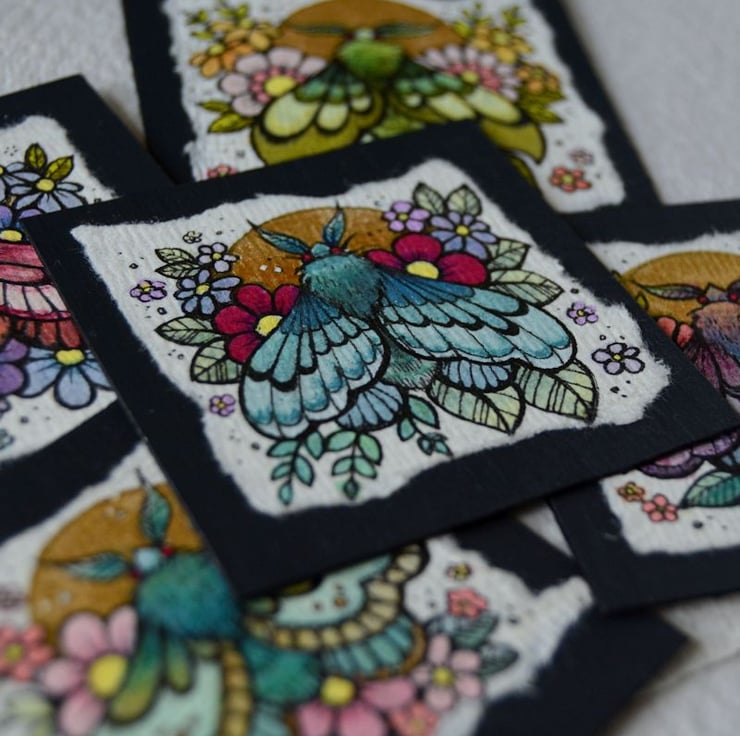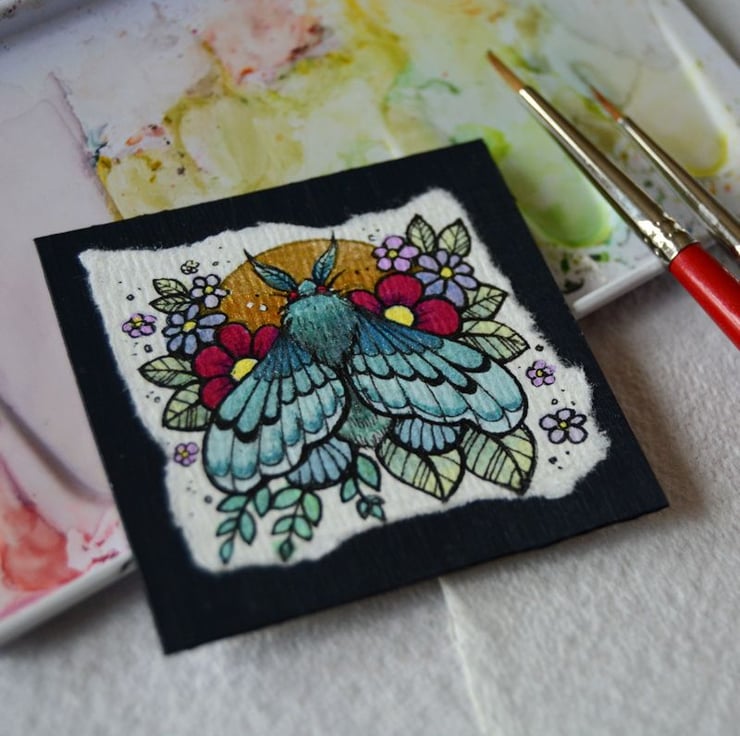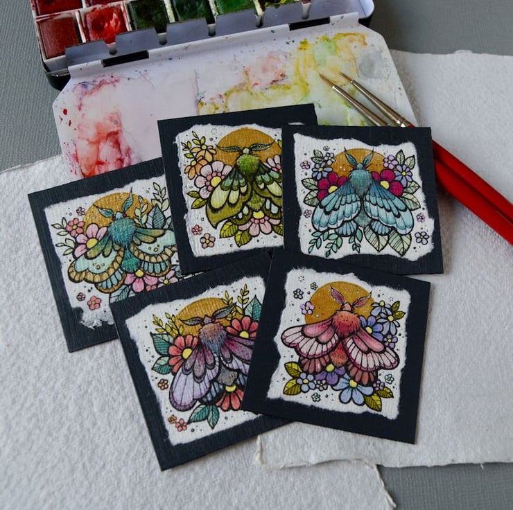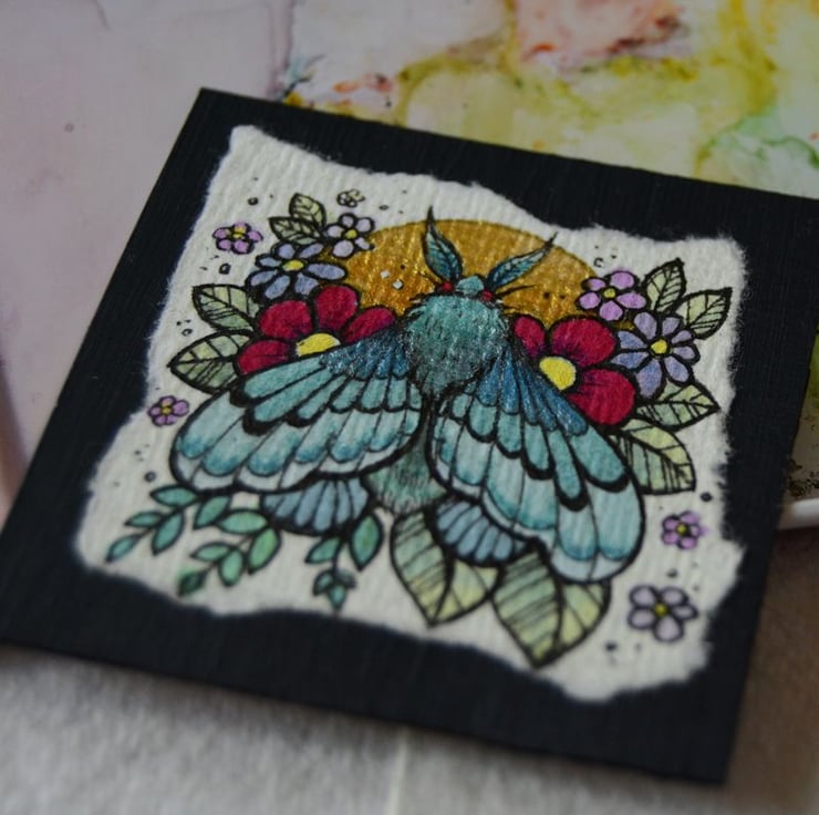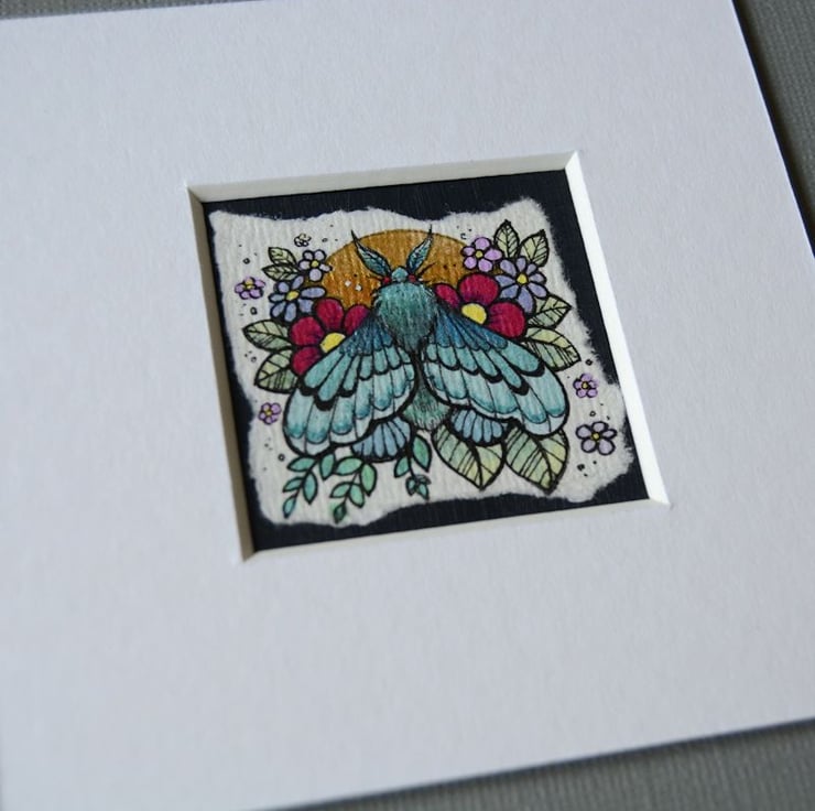 this is an original artwork in artists pens and watercolour pencils and paints, drawn on textured indian khadi paper, which is handmade from recycled cotton rag. the paper has been hand torn with an irregular edge, which I have then mounted to a twinchie painted with a paynes grey acrylic, to create a dark background.