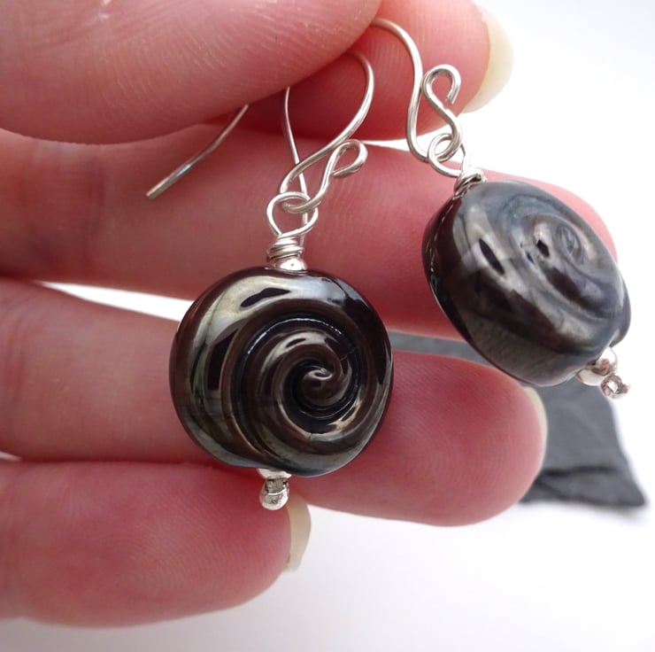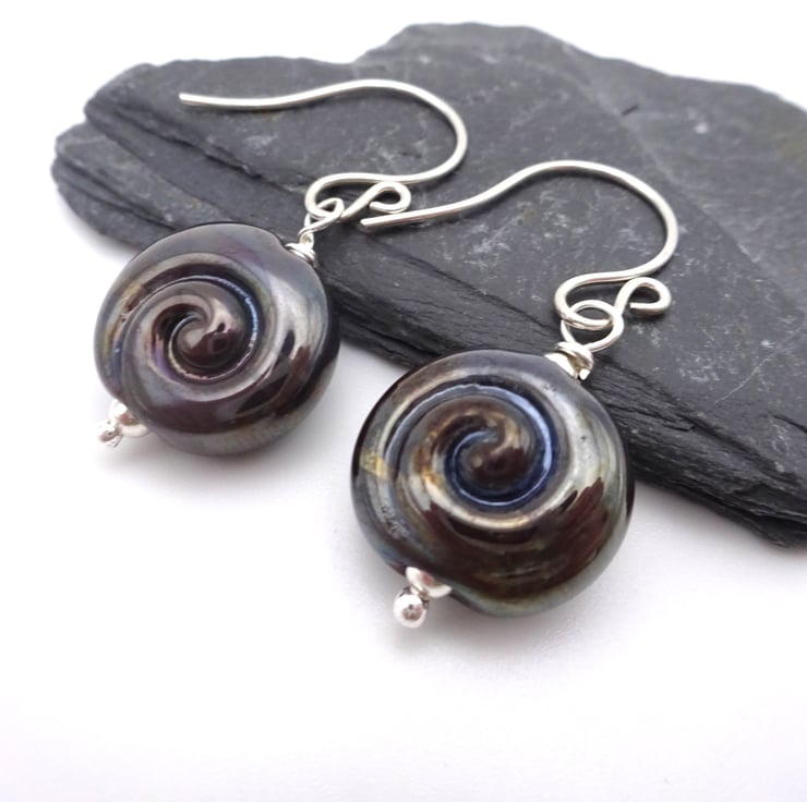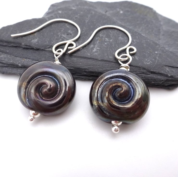 A pair of sterling silver earrings made with handmade lampwork glass beads. The beads have been made with silver/purple glass and stamped with a spiral pattern.