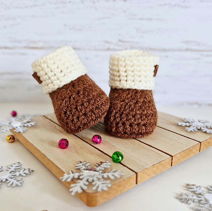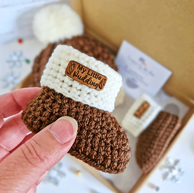 Celebrate the season with these adorable Christmas pudding baby booties — the perfect festive treat for tiny toes. Lovingly handmade in warm brown with cream cuffs and finished with a faux leather tag reading “My Little Pudding”, they make a thoughtful first Christmas gift, or baby shower present.
