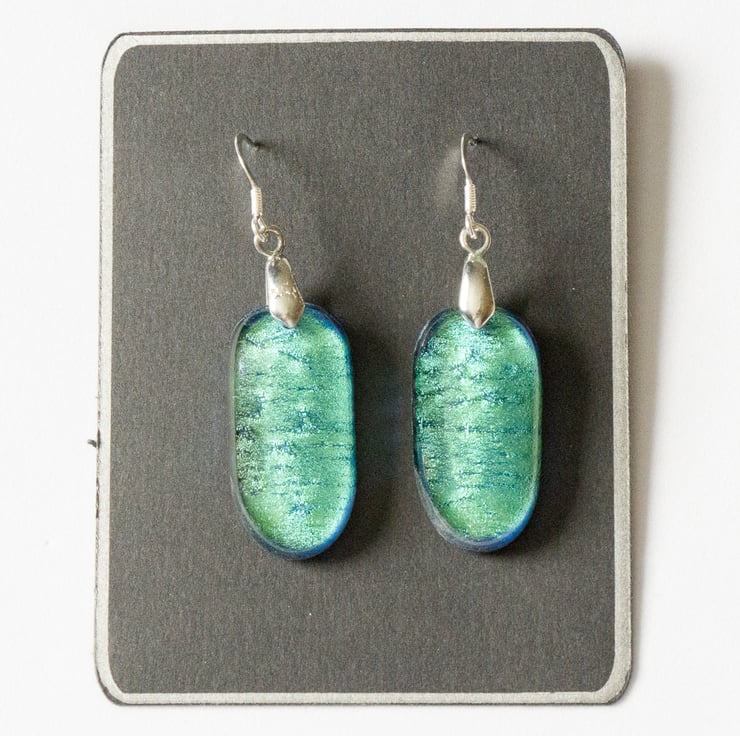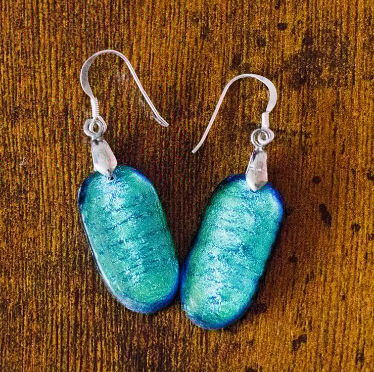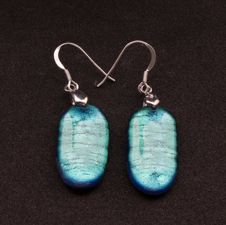 Each earring is a rounded rectangle measuring approximately 3 cm long and 1.5 cm wide. All the glass used has been hand-cut before spending around 24 hours in the kiln. The silver-coloured bail is strung with a sterling silver chain.