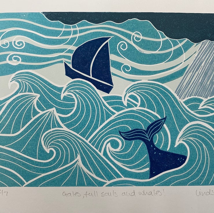 Gales, Full Sails and Whales - Original handmade lino print in limited edition of 12. A 5 colour reduction Lino print individually hand printed on Kent printmaking 190gsm paper with quality water based inks using a Woodzilla relief printing press. Each print is a completly hand made unique piece of original art. Each print contains slight variations in tone and colour overlay making each an individual piece of art.