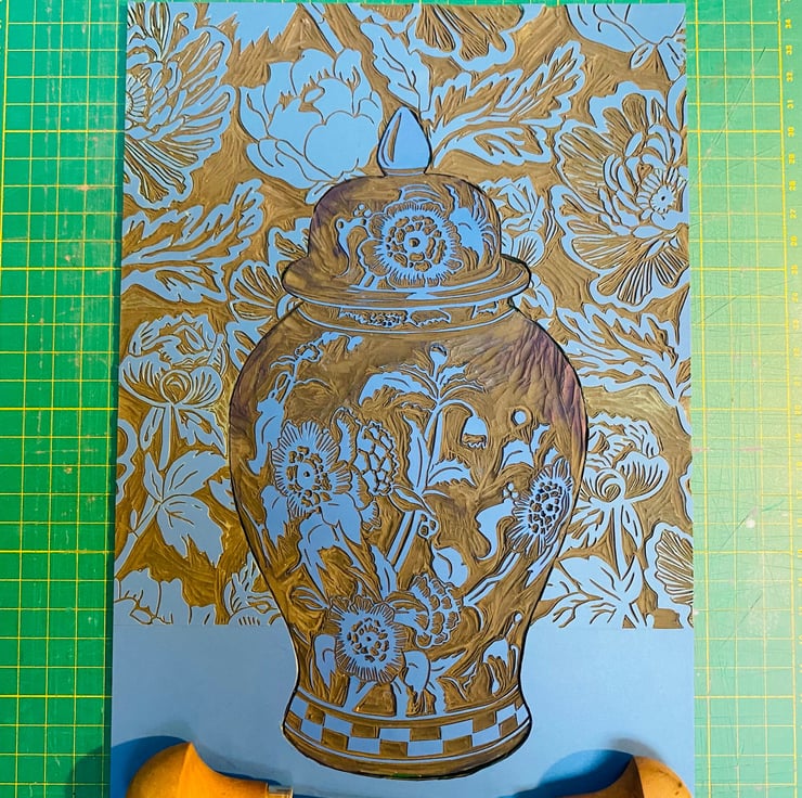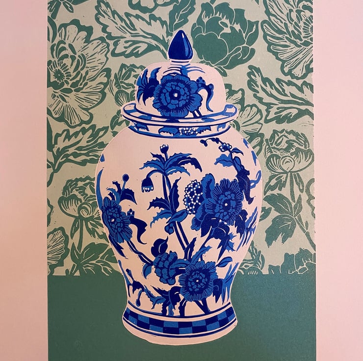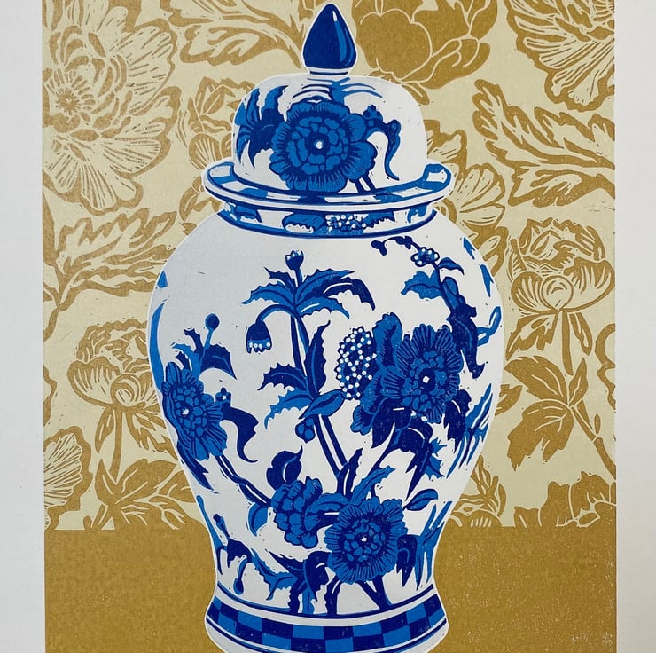 Ginger Jar with Peonies in ochre - Original handmade jigsaw reduction lino print individually hand printed by me the artist, this is not a digital print. Hand Printed on Kent printmakers paper with quality water based inks using a Woodzilla relief printing press. Each colour layer is individually printed and the image has passed through the press 5 times to gradually build an image. The print has been made from a single lino block and is from a limited series of 13 prints. Each is individually hand made and has differing variations in tone and each is a unique piece of art. The print is available in 2 colours green or ochre