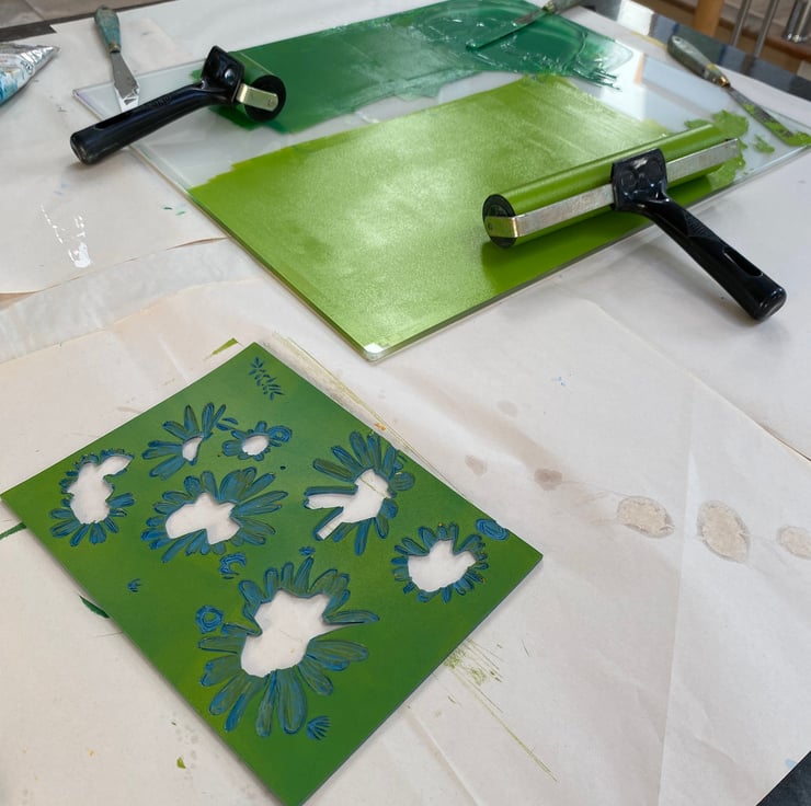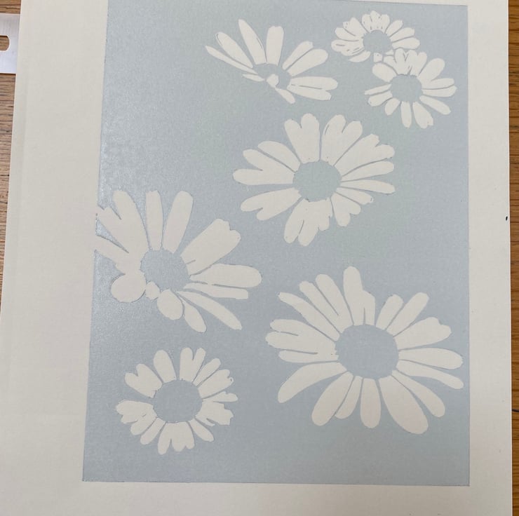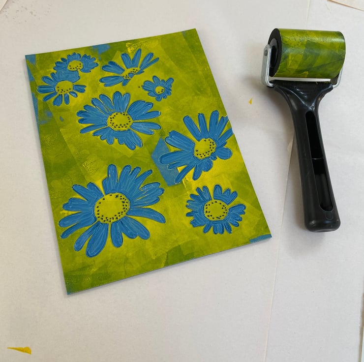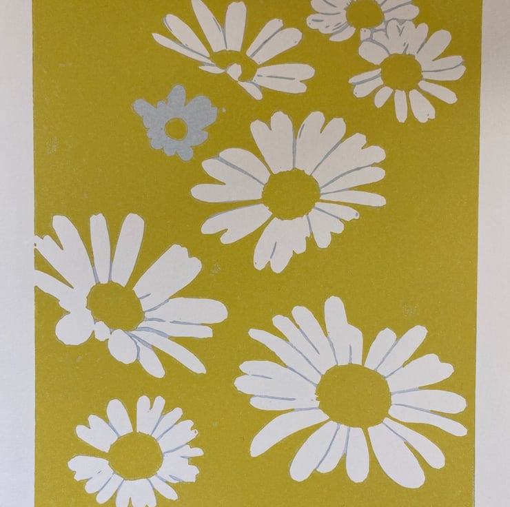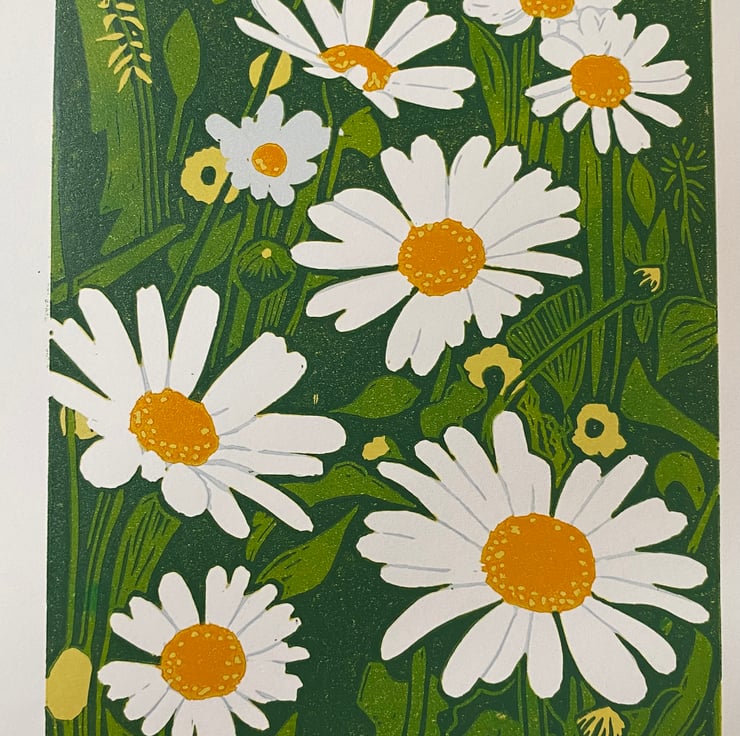 Oxeye Daisies - Original handmade lino print in limited edition of 12. A 5 colour reduction Lino print individually hand printed on Kent printmaking 190gsm paper with quality water based inks using a Woodzilla relief printing press. Each print is a completly hand made unique piece of original art. Each print contains slight variations in tone and colour overlay making each an individual piece of art.