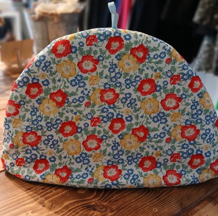 We have used the most beautiful Liberty fabric, Coastal Flowers for this tea cosy, it measures approximately 33 cm wide at the widest part and approximately 22cm in height, ideal for a smallmedium teapot. The tea cosy has been quilted inside, with a coordinating blue cotton fabric.