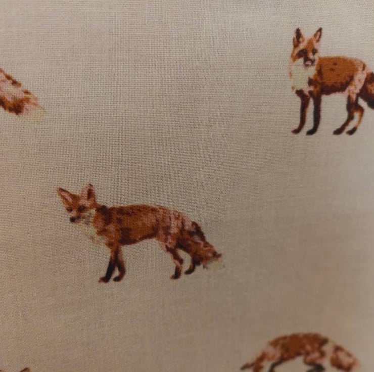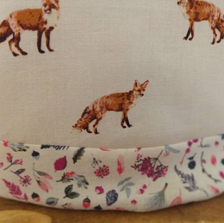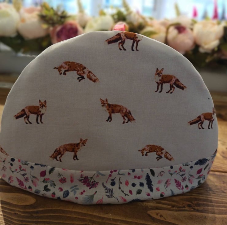 The fox themed fabric tea cosy, with flower border, measures approximately 33 cm wide at the widest part and approximately 22cm in height, ideal for a smallmedium teapot. The tea cosy has been quilted inside, with the coordinating blue cotton fabric.