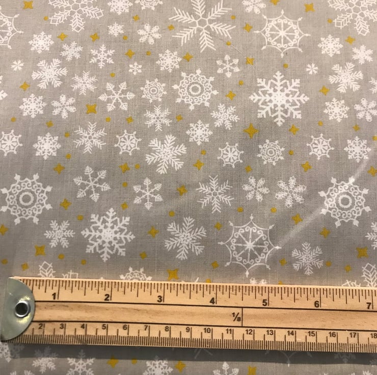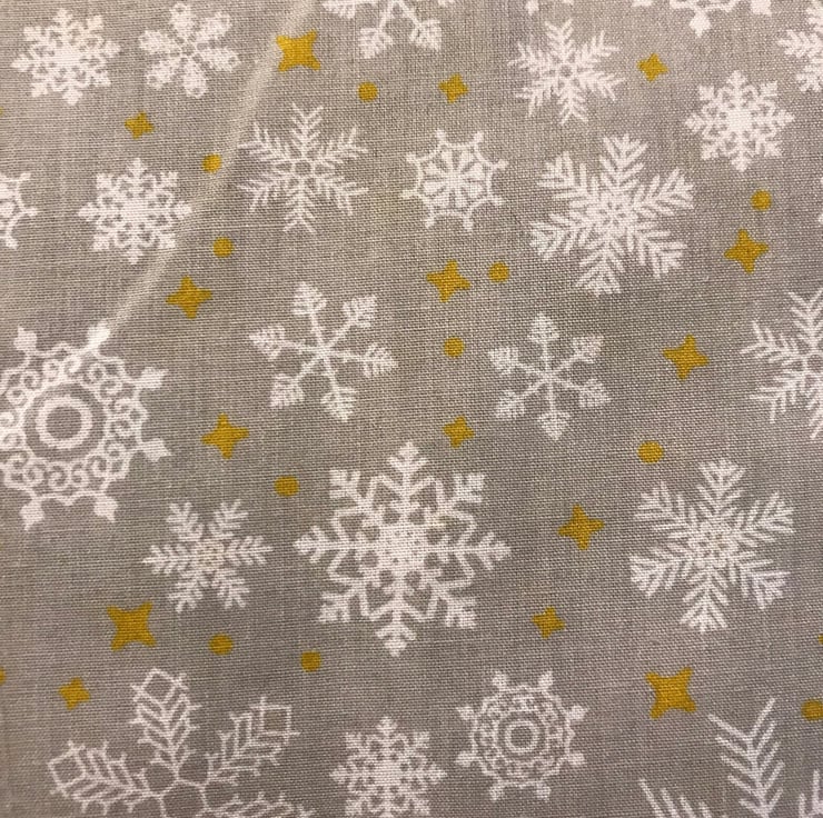 This gorgeous fabric is perfect for any Christmas makes! Absolutely stunning with silver and white snowflake pattern with golden stars.