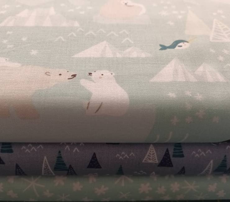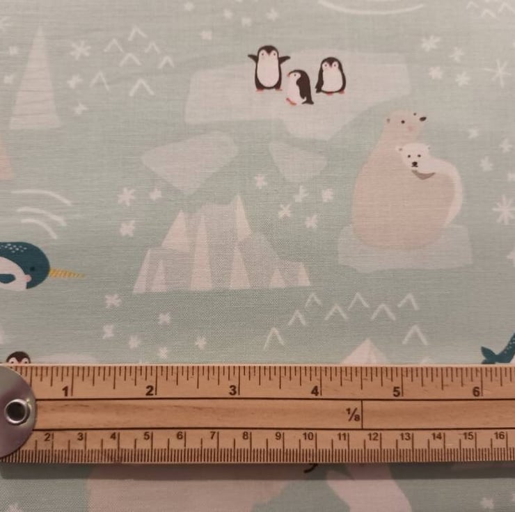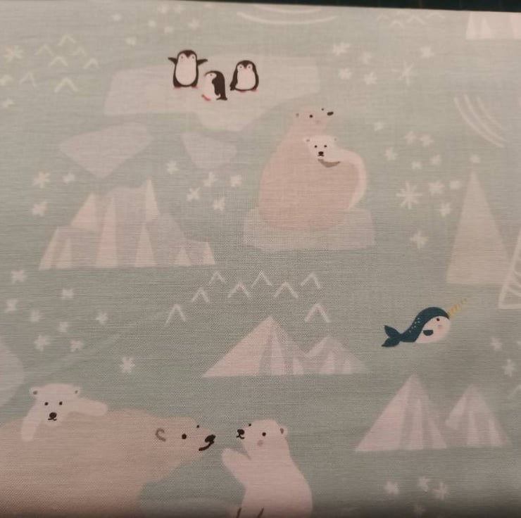 The gorgeous mint and stone coloured fabrics work beautifully together to create a fun, cute fabric with little penguins, polar bears, narwhals, and seals that any child will love!