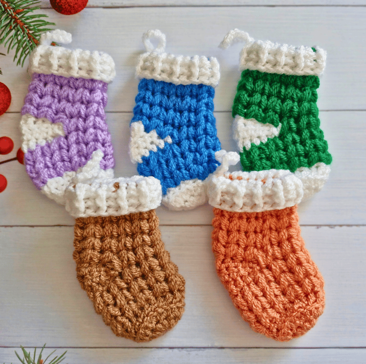Each stocking is crocheted using a textured V-stitch design with a soft white cuff and hanging loop. Three of the stockings feature classic white heels and toes, while two are worked in a solid colour. The set includes a mix of warm and vibrant shades to bring variety and charm to your seasonal setup.