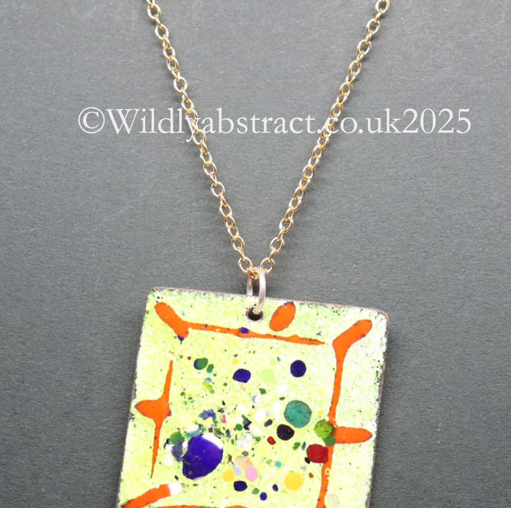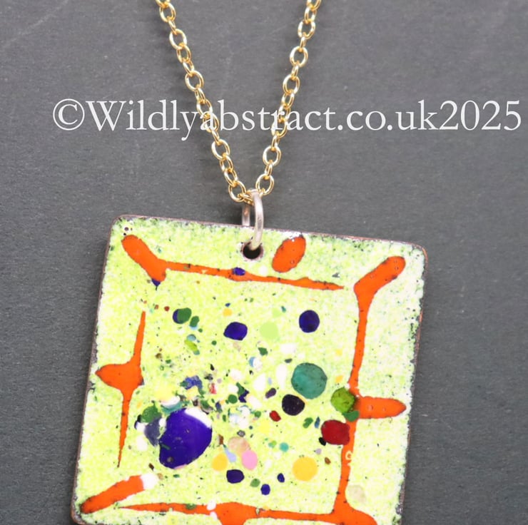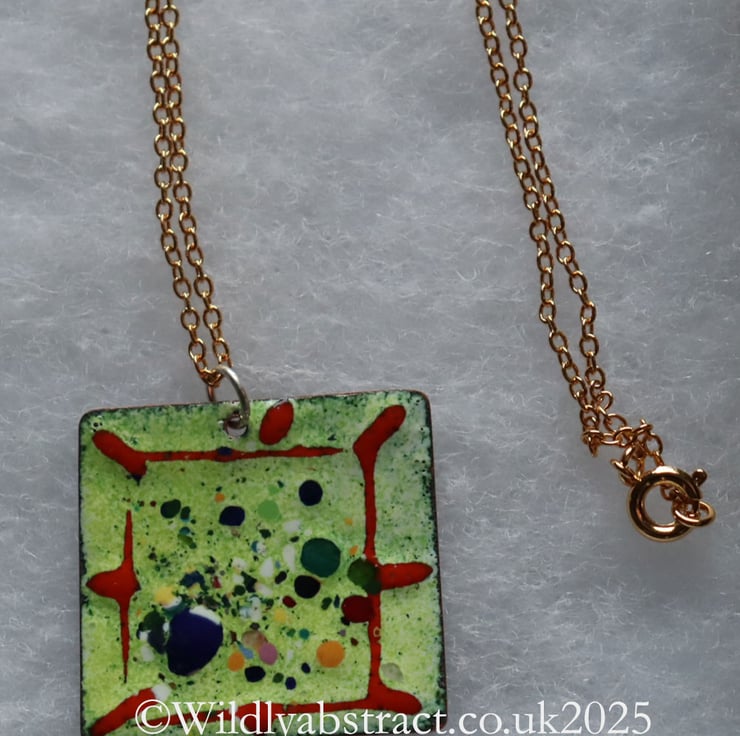 This pendant was handmade using kiln-fired enamels and copper sheet. A base layer of yellow green enamel was coated on a square of copper sheet hand-cut, and decorated with frit and threads hand laid artistically on top of the base layer. The pendant was counter enamelled and fired in the kiln to fuse the enamel. It measures 3cm x 3cms and is hung from a gold plated chain. The total length of the necklace is 25cms.