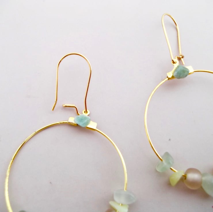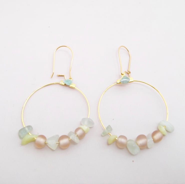 The hoop part has jade stones, yellow calcites, pale pink vintage beads in an ordered style.