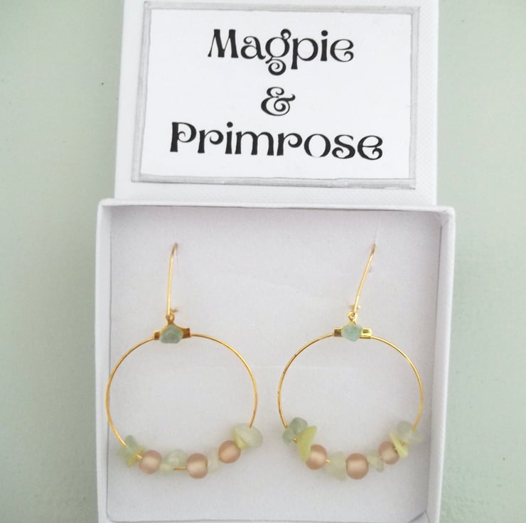 Using some vintage satin glass beads in pale blush pink I threaded them onto purchased gold hoops with jade chip beads for a pretty pair of summery earrings