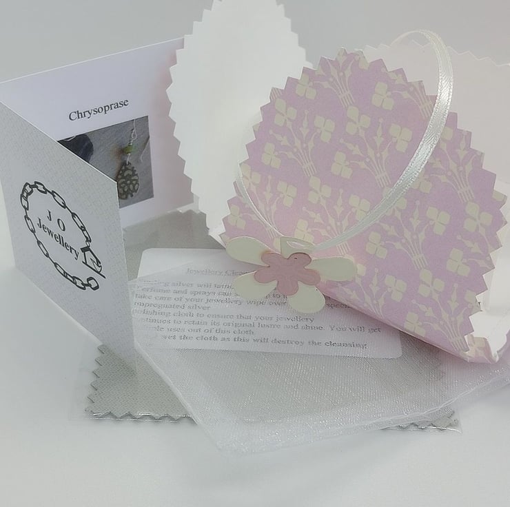 These will arrive in a gift pouch wrapped in a carded gift wrap, also includes a product card and a silver polishing cloth.