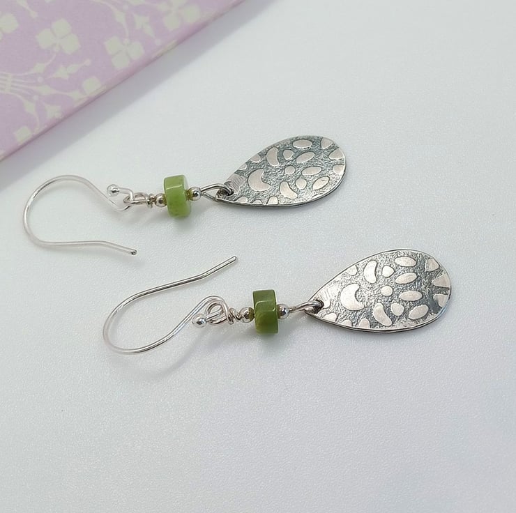 The raindrops are made from solid sterling silver and have an embossed floral pattern on the front which stands proud from the background, the background has been given a light oxidation which lets the pattern detail be the focal, these are suspended from the green chrysoprase 6 mm x 3 mm gemstone bead which is nestled between two sterling silver round beads, the ear drops are suspended fron sterling silver hooks.