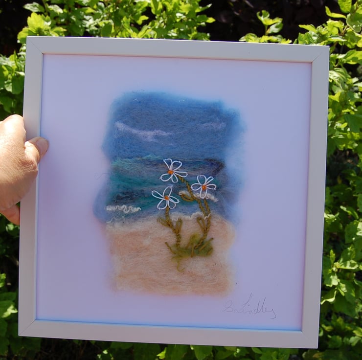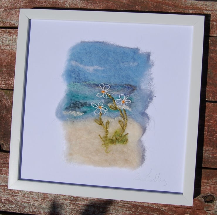 Needle felted onto wool fabric and embellished with hand embroidered daisies.