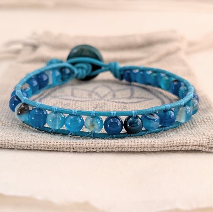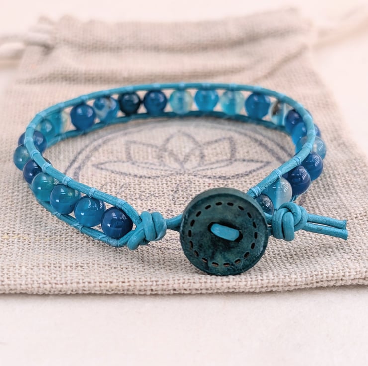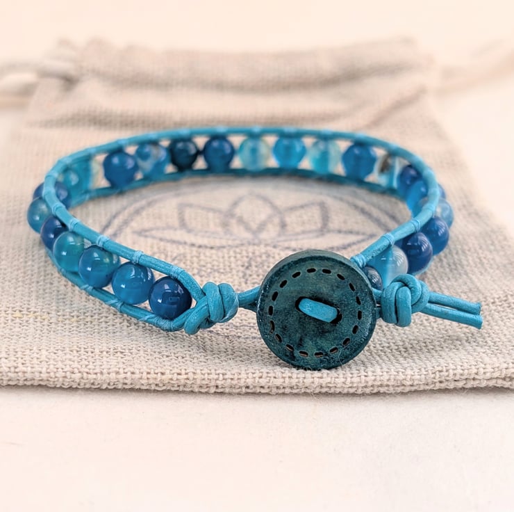 This vibrant turquoise bracelet is made with glossy agate beads stitched securely between genuine leather cord. The coordinating wooden button gives it a neat finish.