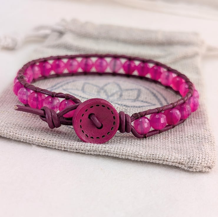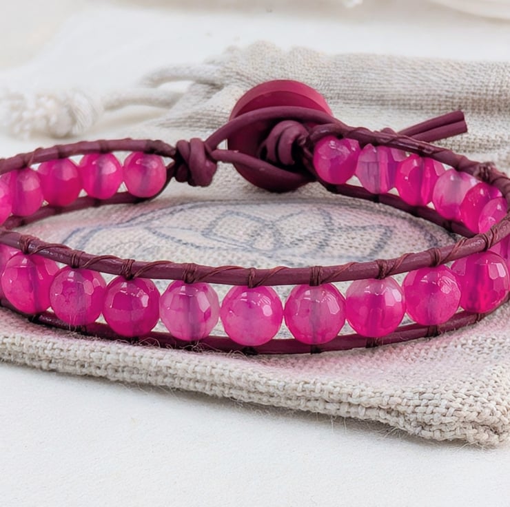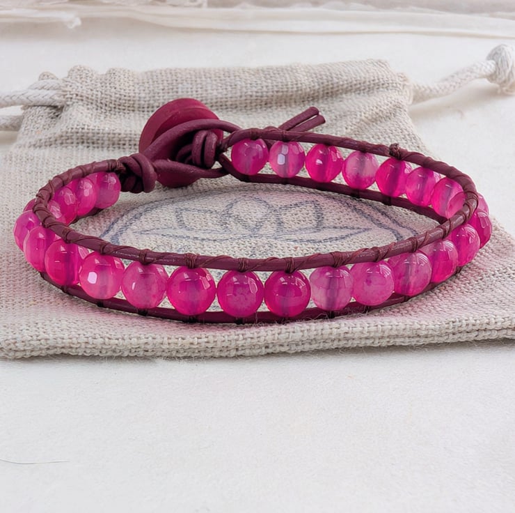 This bold and beautiful bracelet features faceted agate beads in hot pink tones, triple-stitched between deep pink leather cord. The sparkle of the faceted beads catches the light and the matching pink wooden button gives it a cheerful finishing touch.