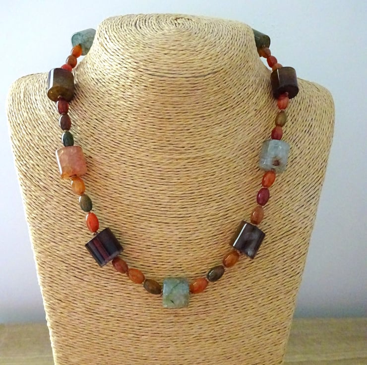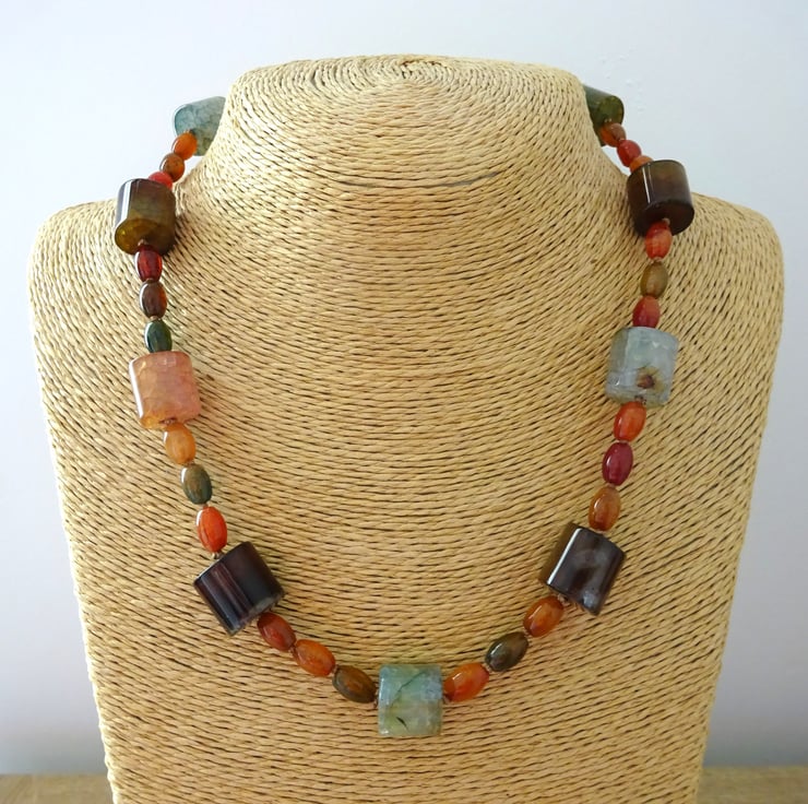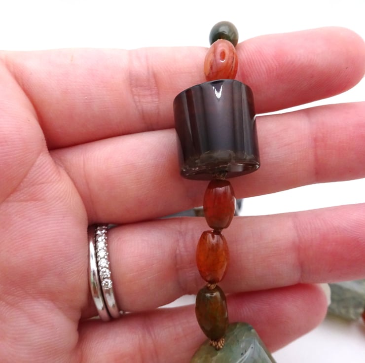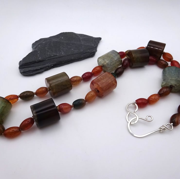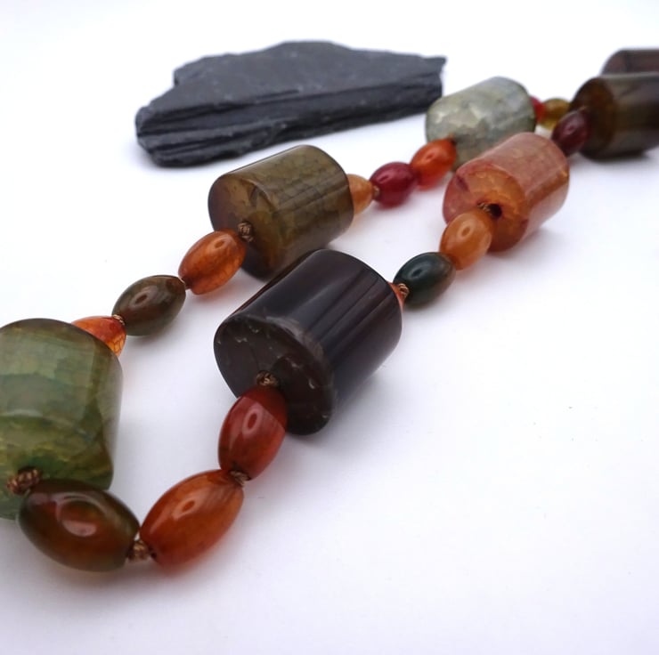 A hand knotted necklace which features large barrel shaped agate gemstone beads and small oval agate gemstone beads.