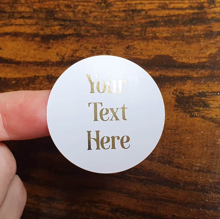 Custom real-foil text on a white background, these 37mm circle stickers are the perfect addition to your small business packaging or party accessories
