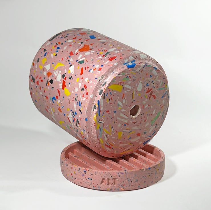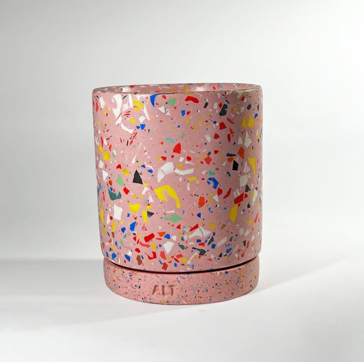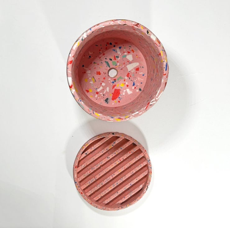 The plant pot was the very first product I ever created. I envisioned a functional yet stylish cylindrical planter with a drainage hole and a separate water tray—perfect for encouraging healthy root growth indoors, whether on a sunny windowsill or in the kitchen. To bring this idea to life, I taught myself 3D design software and used a 3D printer with biodegradable filament to produce the initial prototype. From there, I crafted a mould, allowing me to create bespoke plant pots in any colour combination. Our pink with rainbow terrazzo finish is a maximalist design that brightens up your home. This little planter is ideal for cacti or succulents—a piece we’re truly proud of, combining practicality, sustainability, and contemporary style.