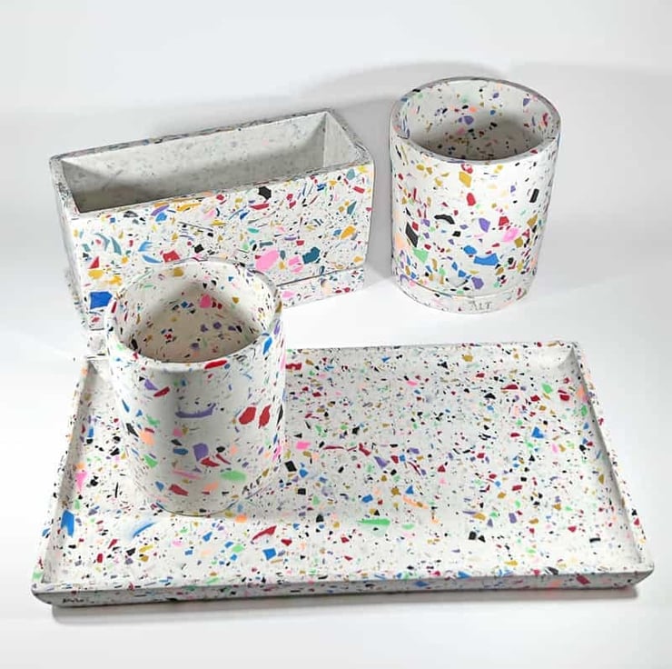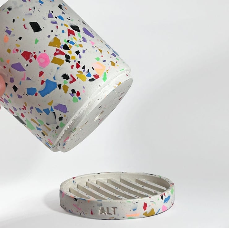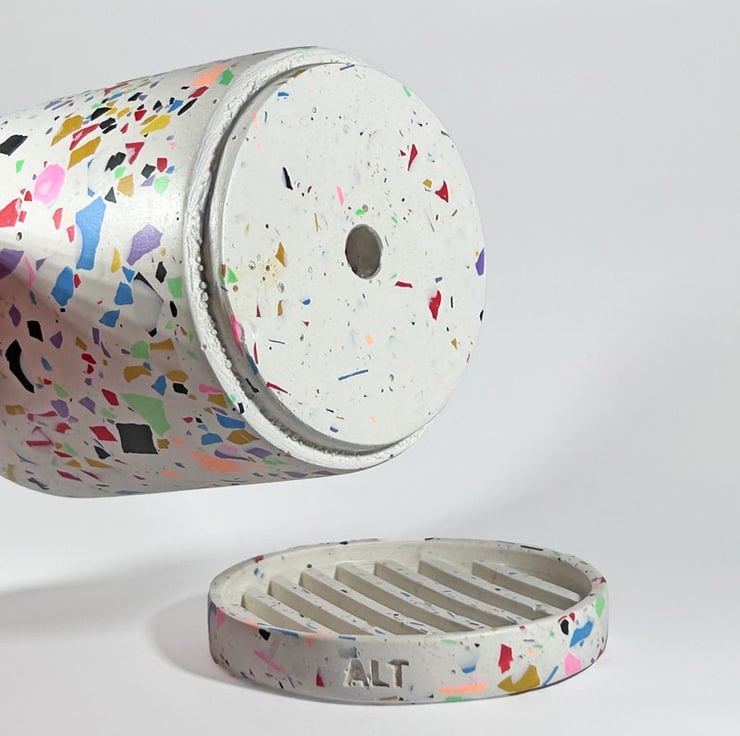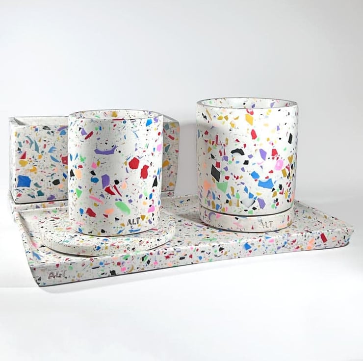 The plant pot was the very first product I ever created. I envisioned a functional yet stylish cylindrical planter with a drainage hole and a separate water tray—perfect for encouraging healthy root growth indoors, whether on a sunny windowsill or in the kitchen. To bring this idea to life, I taught myself 3D design software and used a 3D printer with biodegradable filament to produce the initial prototype. From there, I crafted a mould, allowing me to create bespoke plant pots in any colour combination. Our rainbow confetti style is our most popular design, brightening up any room. This little planter is ideal for cacti or succulents—a piece we’re truly proud of, combining practicality, sustainability, and contemporary style.