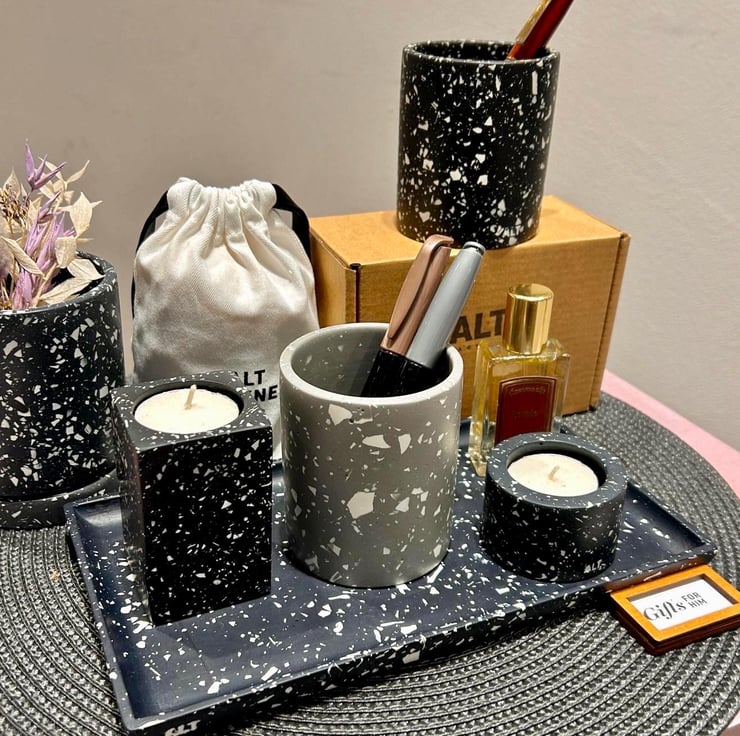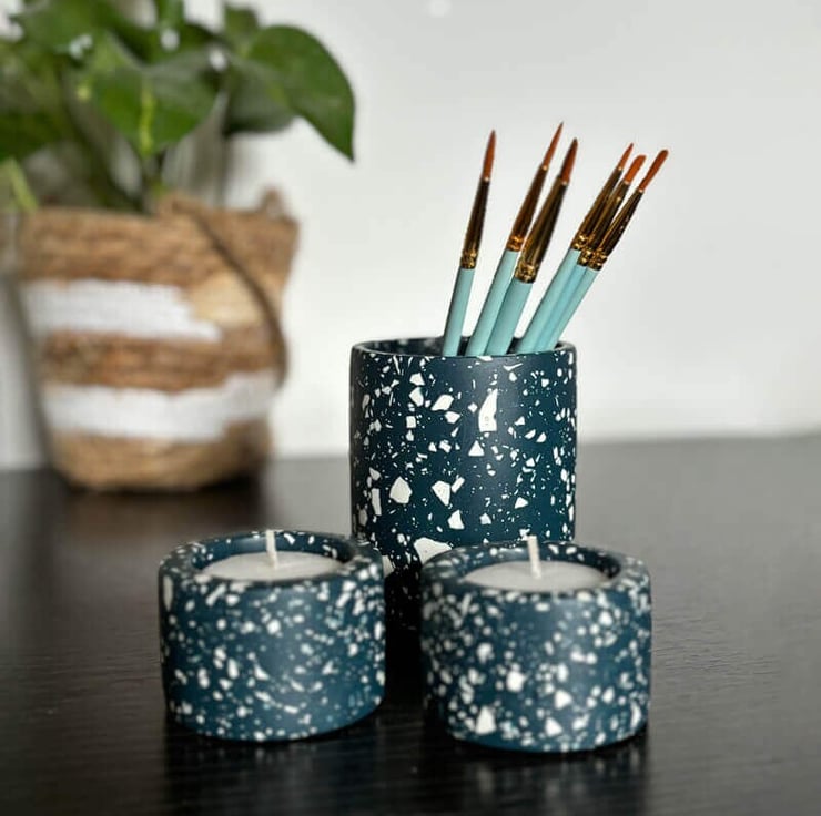 Are you looking for a decorative and handmade tea light holder to spice up your home? Then you will fall in love with this adorable Navy with white terrazzo candleholder. This handcrafted Jesmonite concrete tea light holder is a real eye-catcher and a one-of-a-kind highlight that will instantly transform any space.