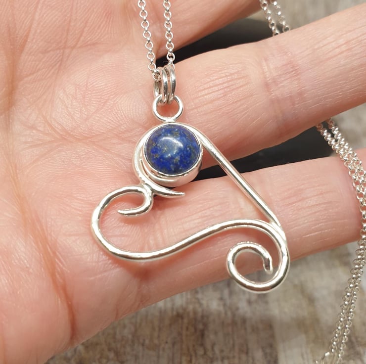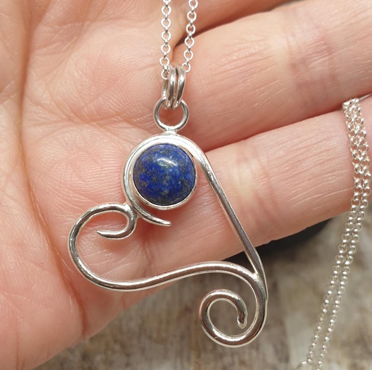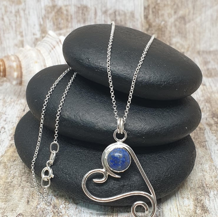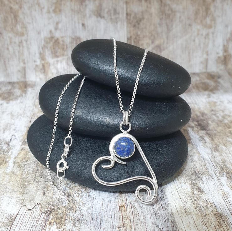Sterling Silver Unique Heart Pendant With Lapis Lazuli Full Hallmark