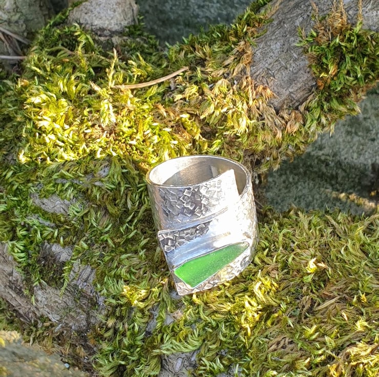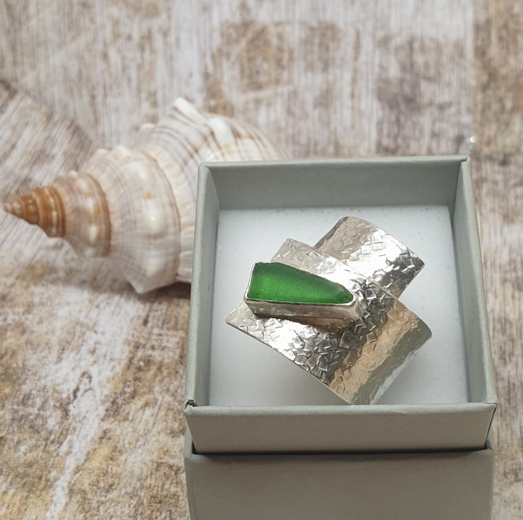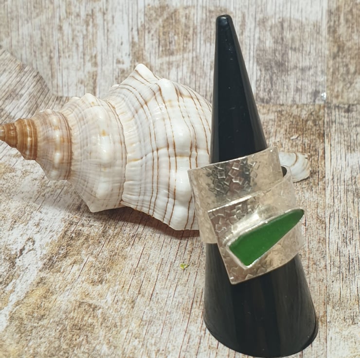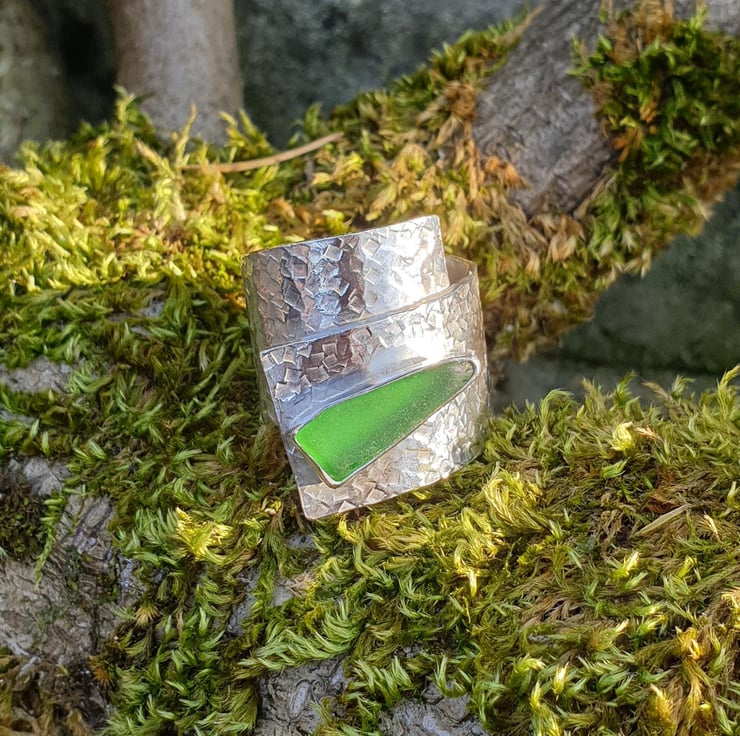 Unique Chuky Light Green Seaham Seaglass Wide Textured Spiral Ring