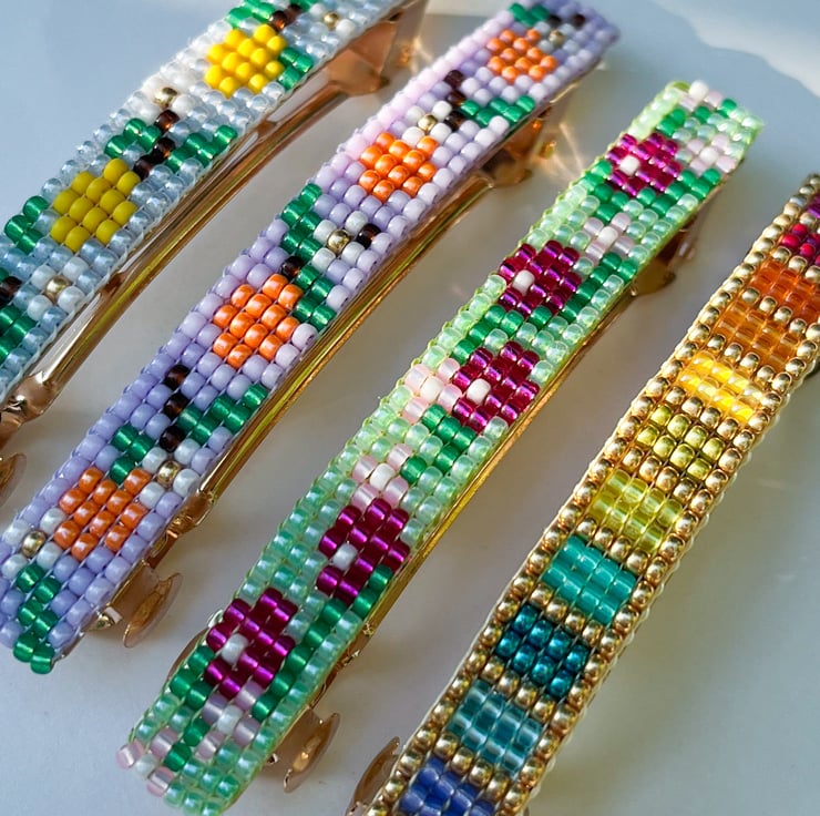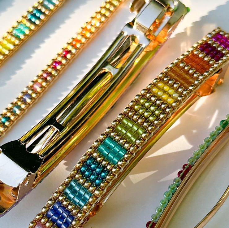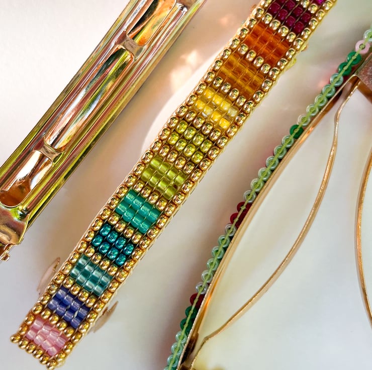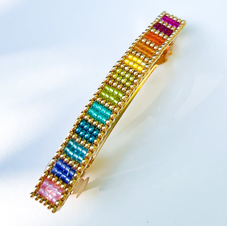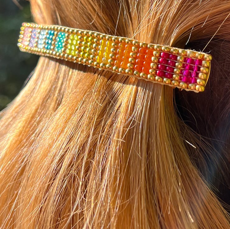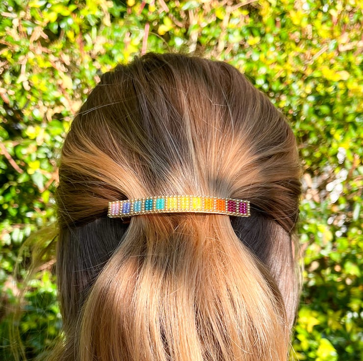 Add a burst of joyful colour to your hairstyle with this handmade rainbow barrette. The beaded panel is woven by hand on a loom using premium Miyuki glass seed beads, then securely attached to a sturdy, gold-coloured metal barrette clip.