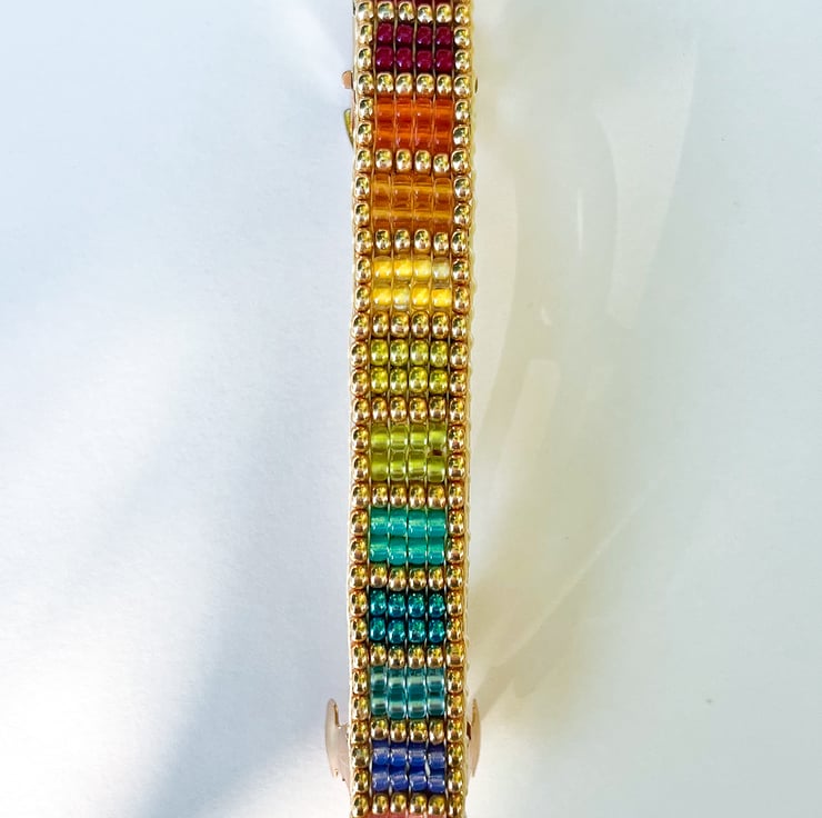 The radiant rainbow gradient is edged with rich gold Miyuki Duracoat beads, catching the light as you move — perfect for summer weddings, festivals, holidays, or simply brightening up your everyday style.