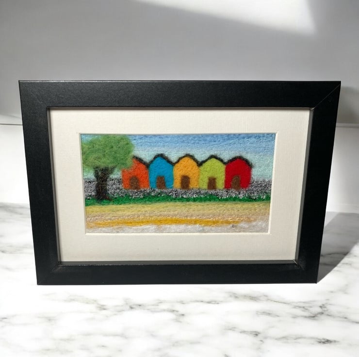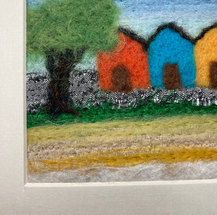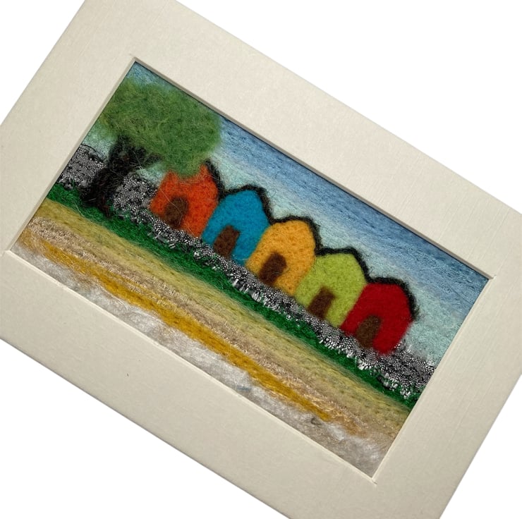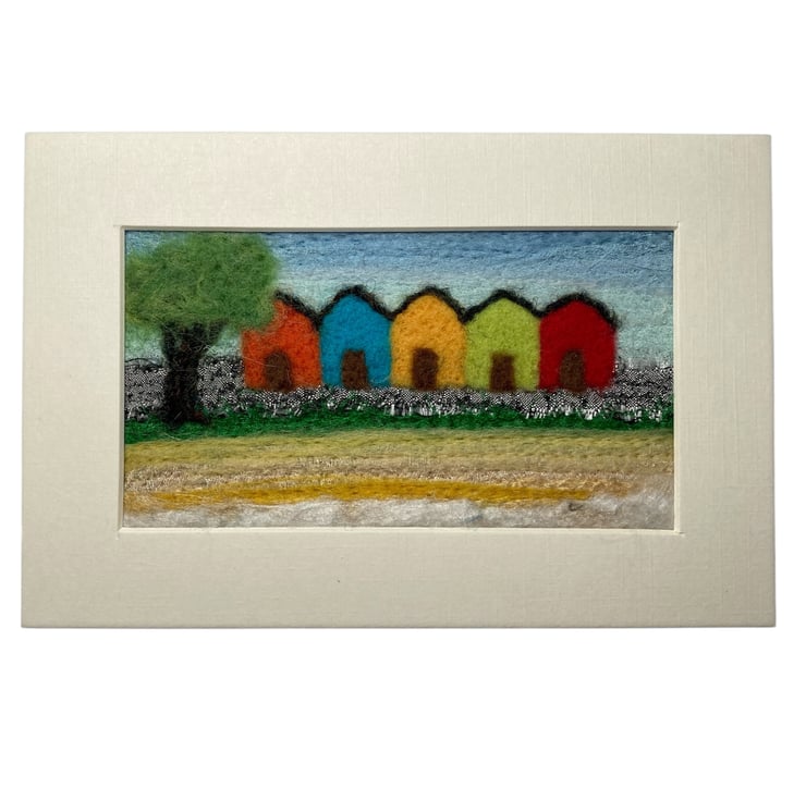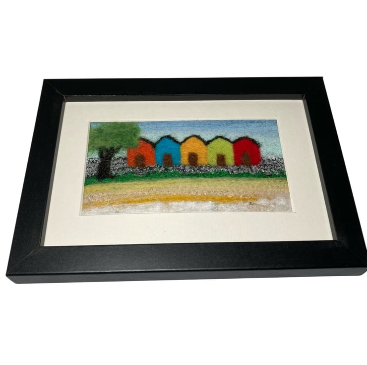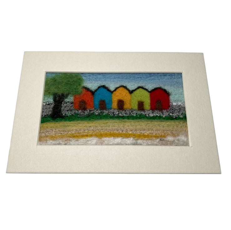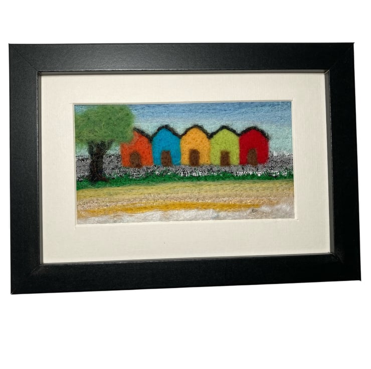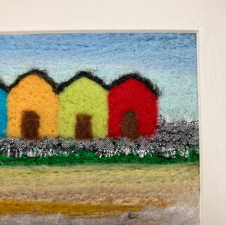 Five brightly coloured beach huts are the subject of this lovely silk and wool textile art picture. The picture is made using strips silk fabric and wool and silk fibres needle felted onto a felt base to create the background of the picture. The beach huts are then cut from flat felt and needle felted into place. The needle felting process, using barbed felting needles, binds the fabric and fibres together without the need for stitching. The process also adds texture to the picture.