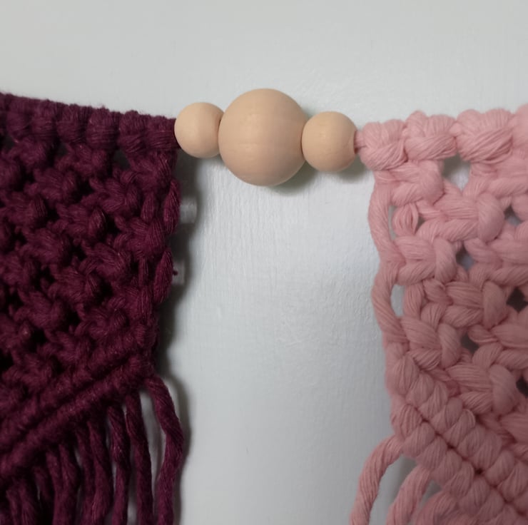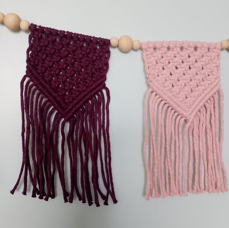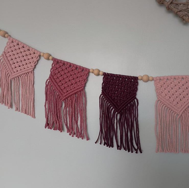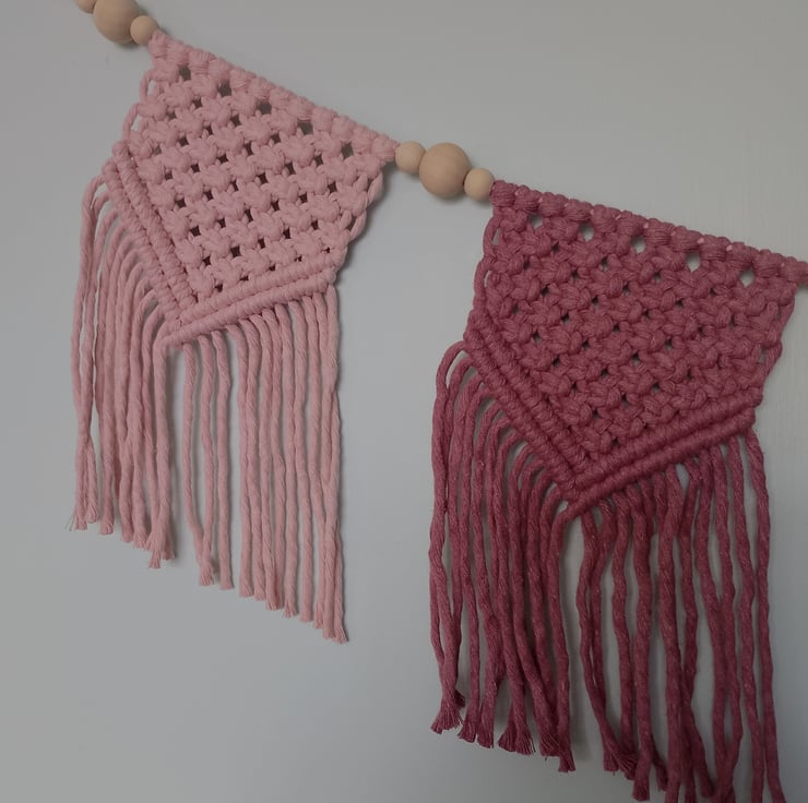 This macrame bunting has been made using lovely shades of pink and plum which match each other beautifully! This bunting would make a pretty addition to a nursery or bedroom. The cord is made from 100% recycled cotton making them eco friendly too!
